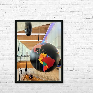 This artistic display hanging from the ceiling at La Guardia Airport. This immersive installation blends bold cartographic globes with sleek, suspended droplets to create a surreal, contemplative atmosphere. The juxtaposition of massive orbs and teardrop forms evokes themes of gravity, balance, and global interconnectedness. As wall art, it becomes a bold statement piece, inviting reflection on movement, presence, and the delicate forces that shape our world.
