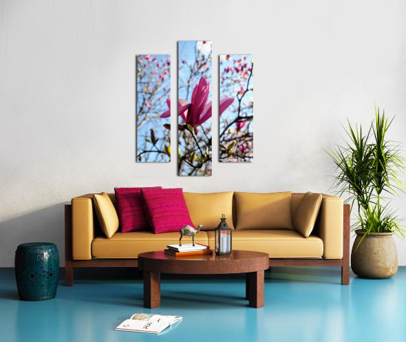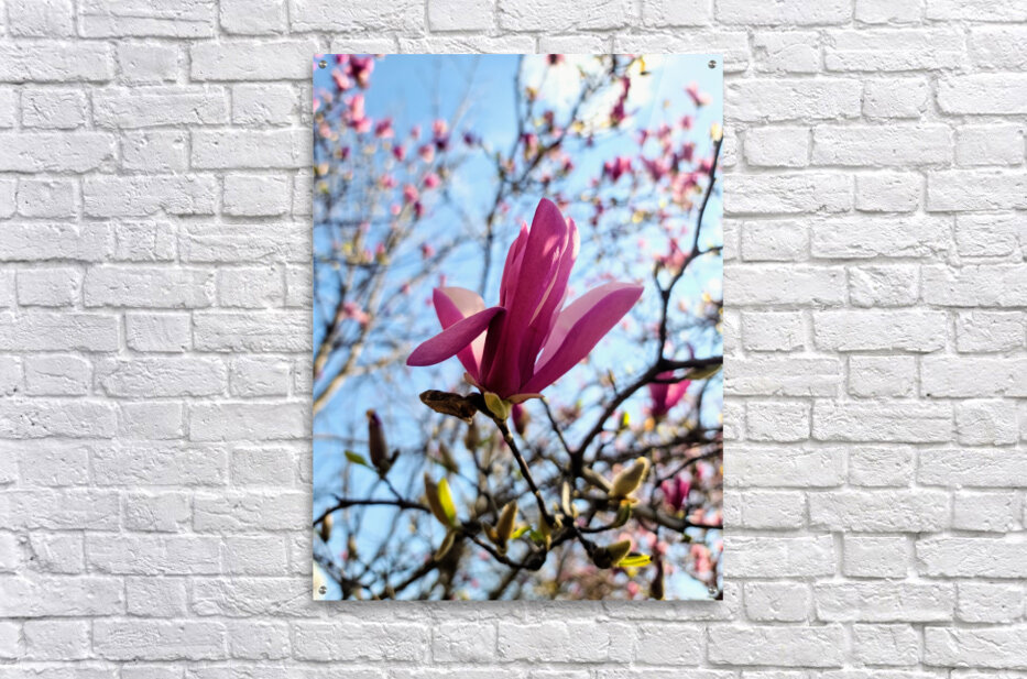 Magnolia Collection. This vivid composition captures a magnolia blossom stretching open under a bright sky, its magenta petals tenderly unfolding as sunlight filters through delicate branches.This floral portrait celebrates the transient yet powerful moments when life reaches for the light. As wall art, this piece is an invitation to pause and connect with the quiet resilience of nature. It brings a feeling of calm energy to any space a gentle reminder that growth happens not with noise, but with grace. Ideal for spaces where introspection, clarity, or peaceful energy is desired, such as meditation rooms, reading nooks, or modern living spaces.