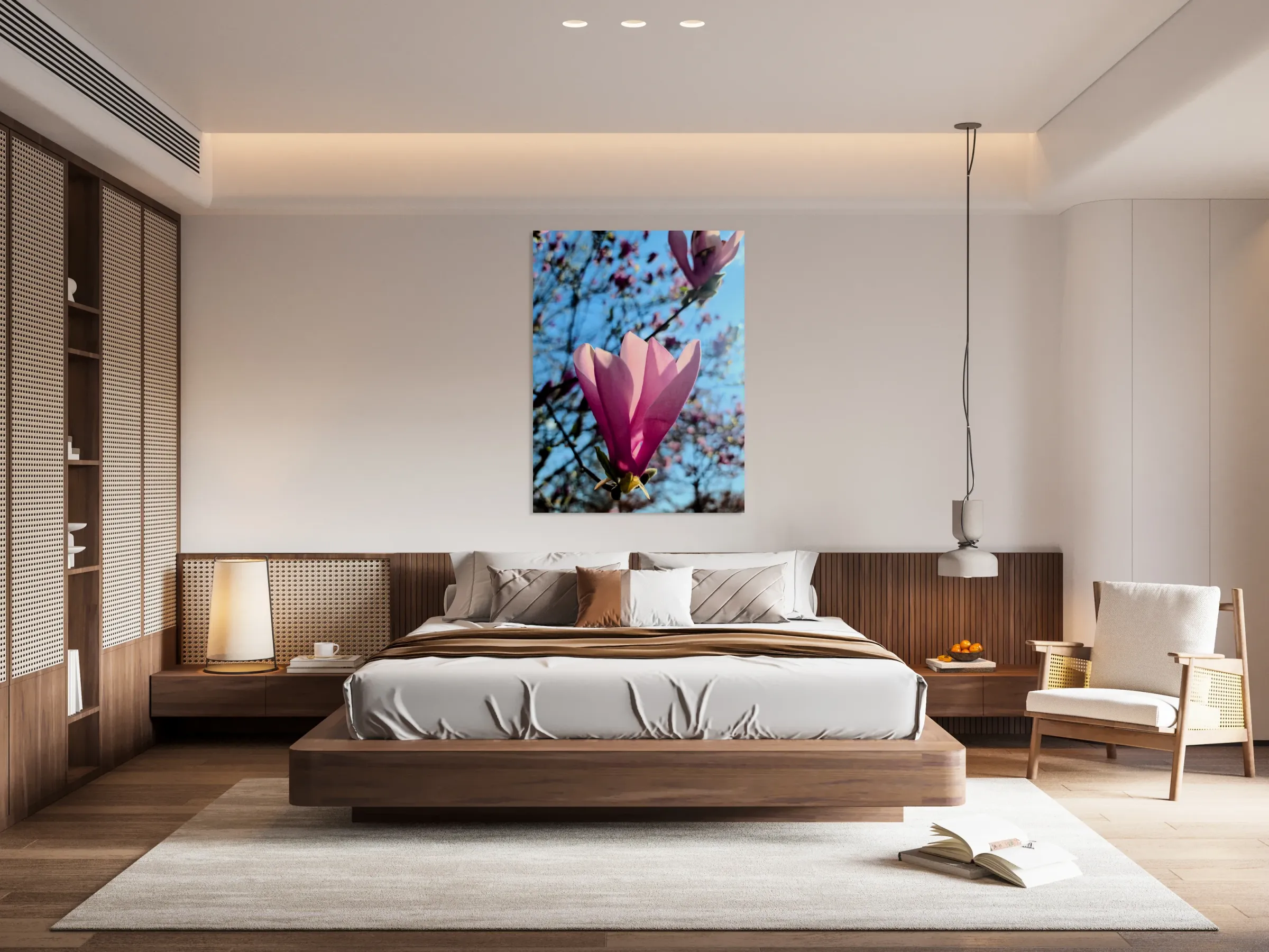 Magnolia Collection. This image captures a single magnolia bloom, softly lit by early sunlight. The delicate folds of pink petals seem almost translucent, radiating warmth and quiet confidence. It’s not just a flower, it’s a portrait of stillness, reaching gently toward a blue sky. As wall art, this piece evokes inner calm and gentle awakening. It speaks to the quiet power of nature, how something so delicate can command attention without sound. Perfect for meditation rooms, sunlit kitchens, or personal retreats, this photo invites the viewer to pause, reflect, and breathe. It’s a gentle reminder that strength and softness often bloom together.