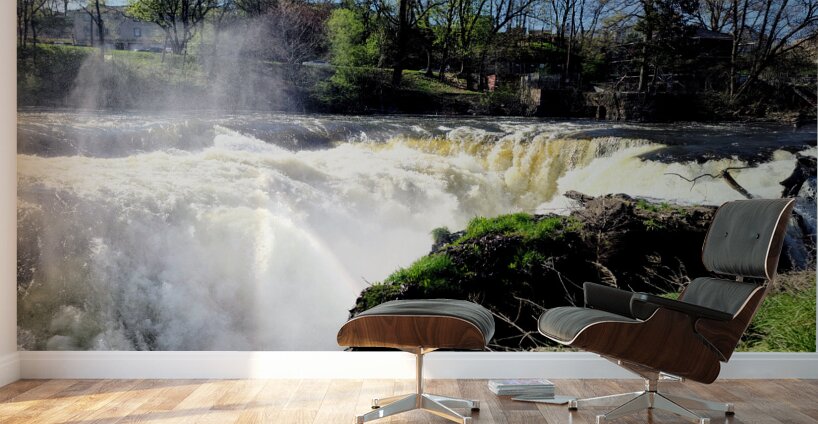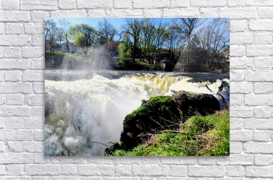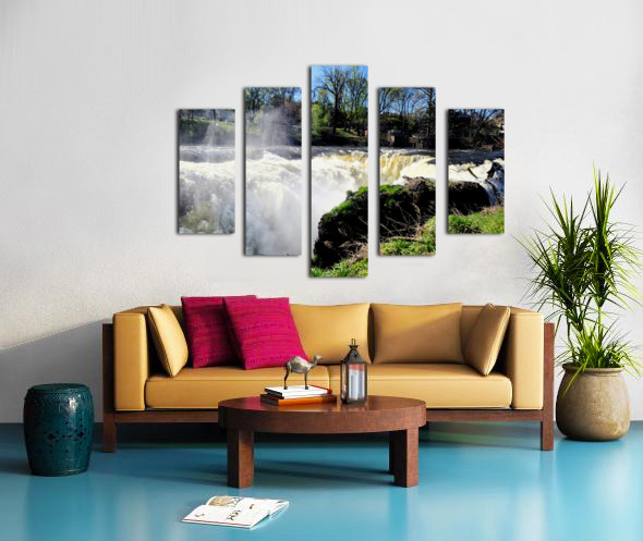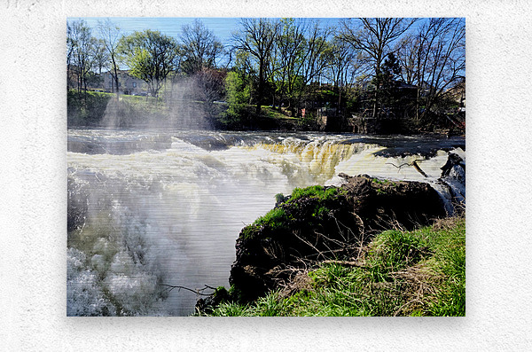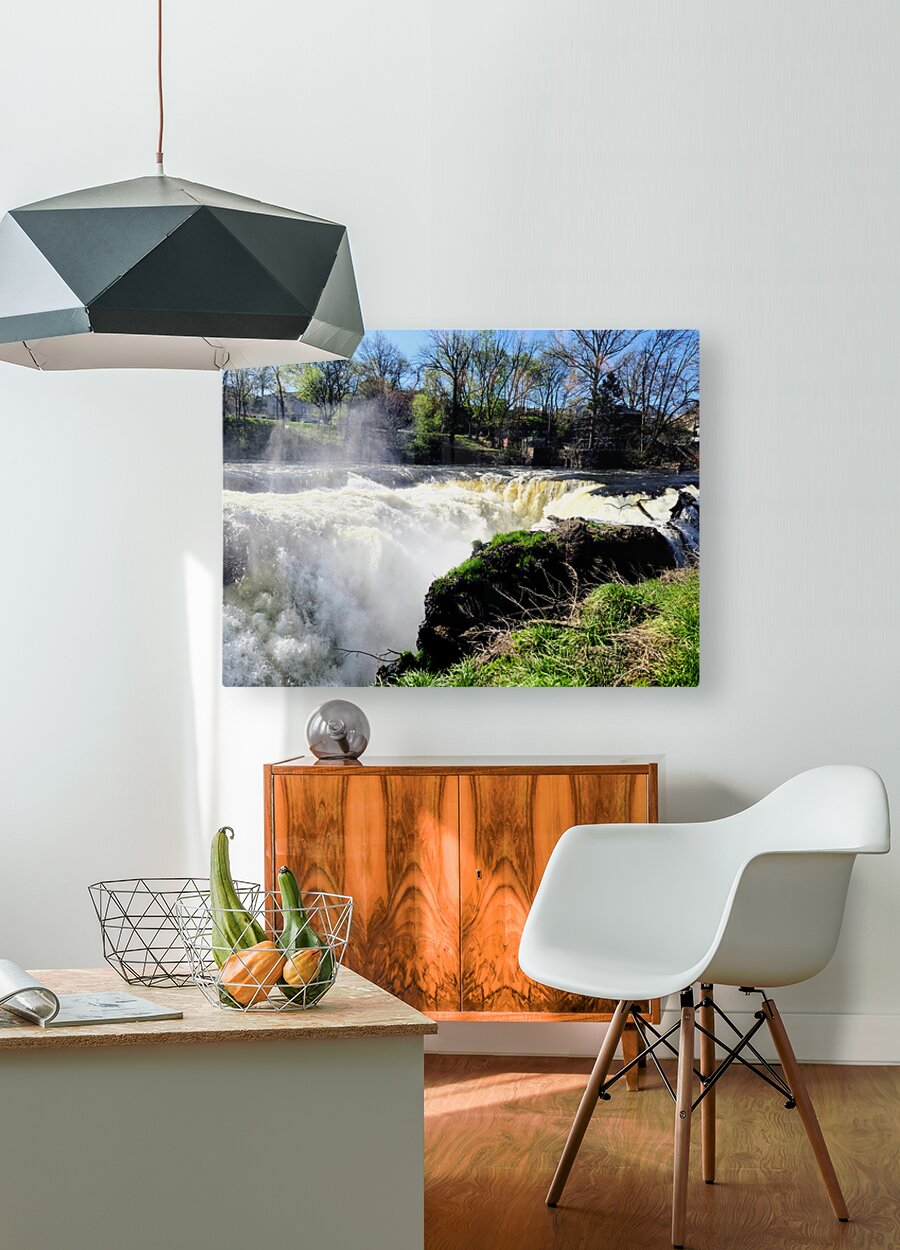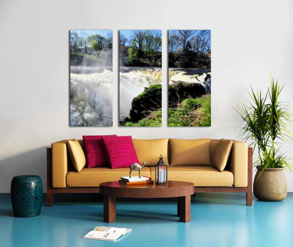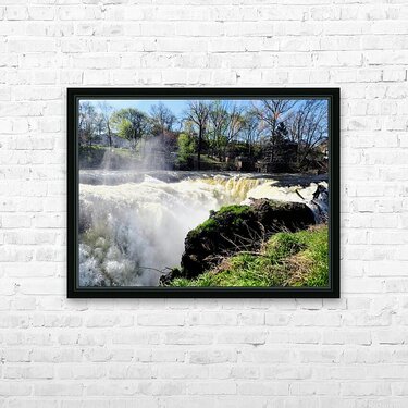 Paterson Great Falls Historic National Park New Jersey Collection. It was one of the largest waterfalls in the US, less than an hour outside Manhattan. Bathed in sunlight and framed by awakening trees, this waterfall roars not in anger, but with the joy of return. The skies are clear, but the river remembers the storms. It's a celebration of survival, of renewal, and the raw beauty that follows struggle. Hang this in bright, open spaces to bring in contrast, between the calm of sky and chaos of water. It reminds us that even on the brightest days, our past strength flows forward with us. It's wild, it's real, and it's alive.
