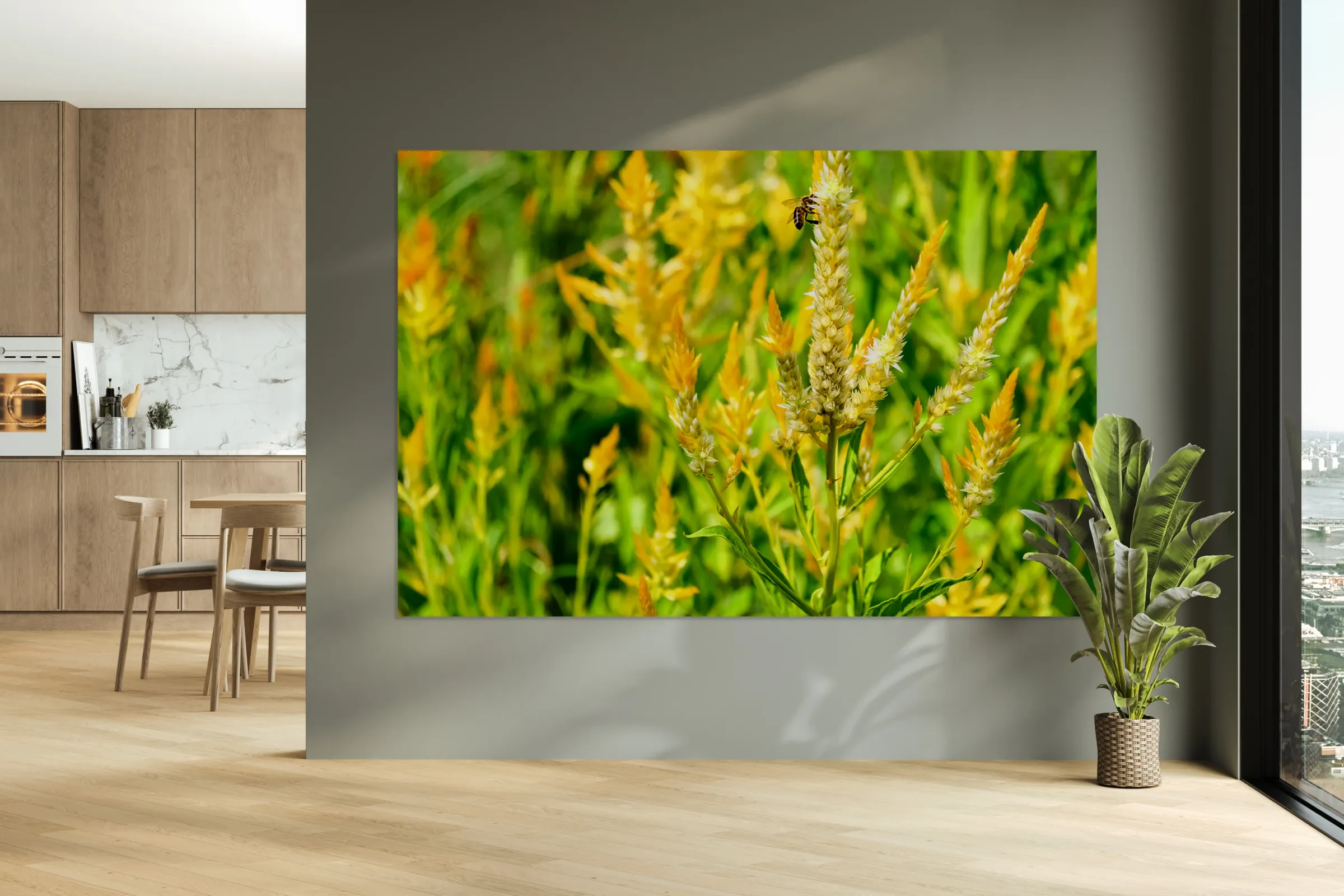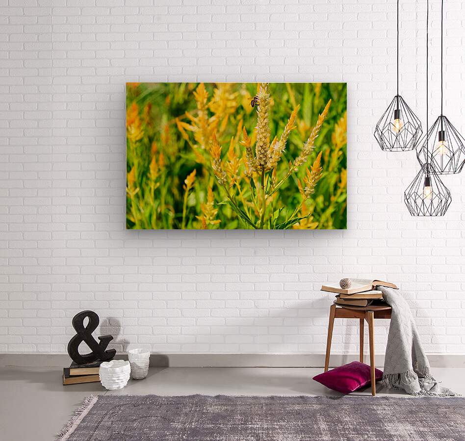 A field ablaze with celosia bursts like natural fireworks, while a lone bee weaves its quiet path through the riot of bloom. This photograph captures the essence of movement within stillness, of fire within softness. The composition invites you to linger in the wild rhythm of the moment. It radiates passion and subtle movement ideal for creative environments, art studios, or vibrant home offices. It turns any wall into a living poem about nature’s kinetic beauty and the elegant urgency of pollinators.