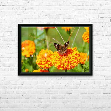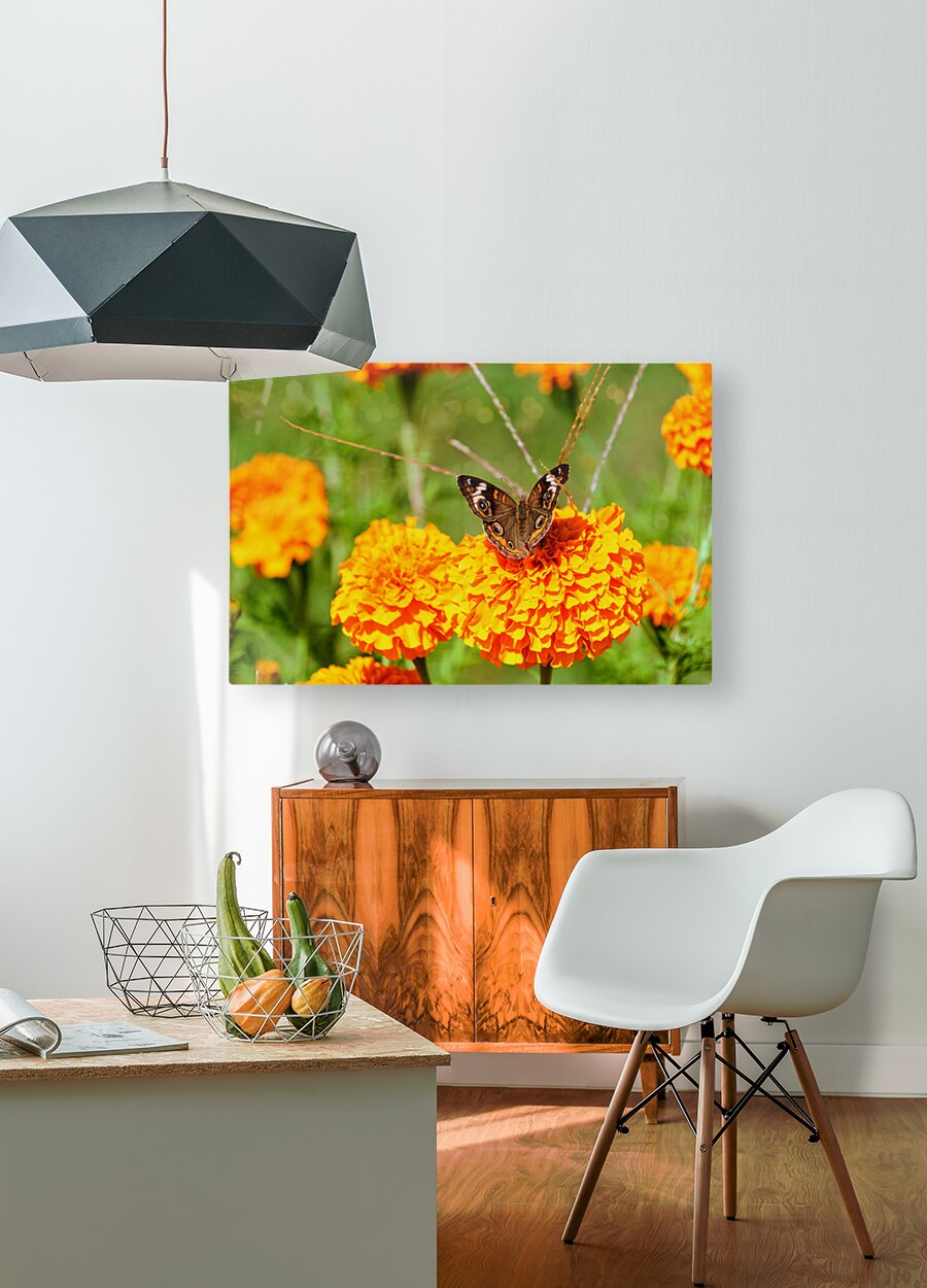 Butterflies Collection. This photograph captures more than a butterfly on a flower, it’s an ode to the unscripted theater of the natural world. The marigold glows with sun-fired color, and the butterfly, wings aglow with natural eyespots, pauses like a poet on stage. Every detail tells a story: of pollen-dusted mornings, fleeting grace, and the harmony between fragility and color. A conversation starter and soul-calmer in one. As wall art, this piece radiates warmth and balance. It reminds us that grace is often quiet, and life’s beauty often happens when we’re not looking. Perfect for a studio, reading nook, or sunroom.