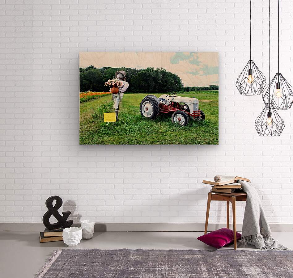 A field brimming with green hums with quiet life where even the scarecrows hold bouquets. The tractor seems more like a monument than a tool, captured in a moment of stillness, as though aware of the watcher. Soft clouds, bold colors, and rustic charm collide in a scene that’s almost too perfect to be real. Hang this piece to spark curiosity. Is it staged or spontaneous? Real or imagined? It brings storytelling energy into a room equal parts pastoral calm and playful mystery. A fantastic fit for eclectic, rustic-modern, or storytelling-inspired interiors.