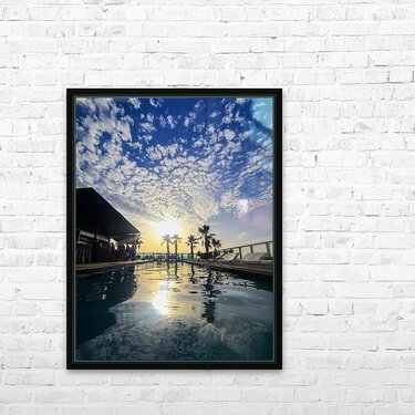 A golden sun kisses the horizon as the sky bursts into a mosaic of clouds, casting a mesmerizing pattern above a peaceful pool. Silhouettes of palm trees line the path toward the sea, mirrored in still waters that seem to stretch into forever. This is a slice of paradise, captured at the perfect moment when time stands still and beauty echoes in every reflection. This piece invites the viewer to pause, breathe, and drift into a tranquil state of mind. Ideal for spaces needing calm and presence, it serves as a daily reminder to find your oasis in the everyday chaos—a perfect harmony of earth, water, and sky.