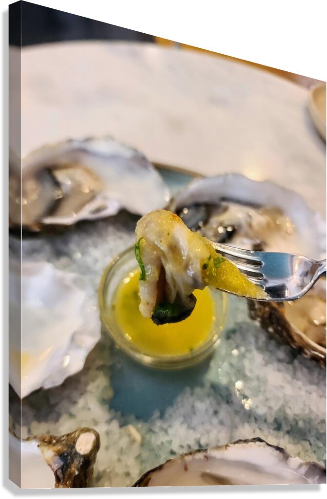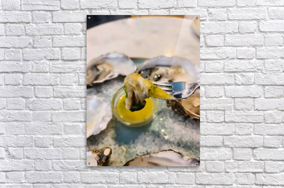 A quiet lament from the sea, “Elegy in Shell Minor” transforms a single bite into a visual composition of loss and luxury. The glint of lemon butter plays the high notes; the cool salt bed hums beneath. The oyster, caught mid-lift, becomes a final stanza in a song only the ocean remembers. As wall art, it blends mood, minimalism, and culinary sophistication—evoking both reverence and indulgence. A beautiful fit for piano nooks, moody kitchens, or dining spaces that embrace emotion and flavor in equal parts.