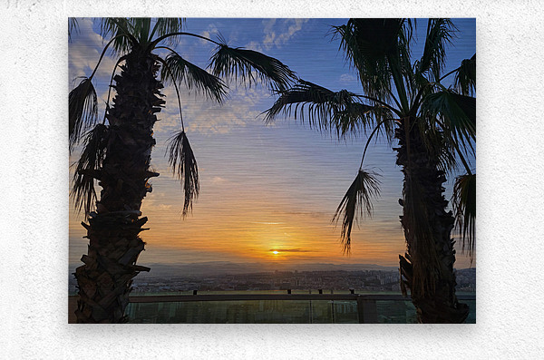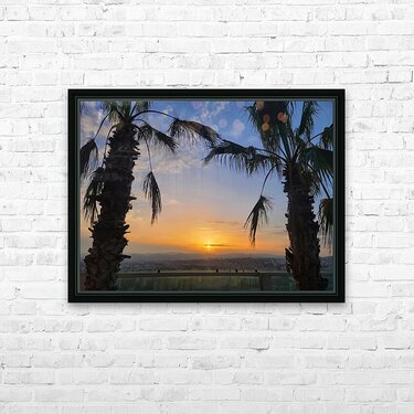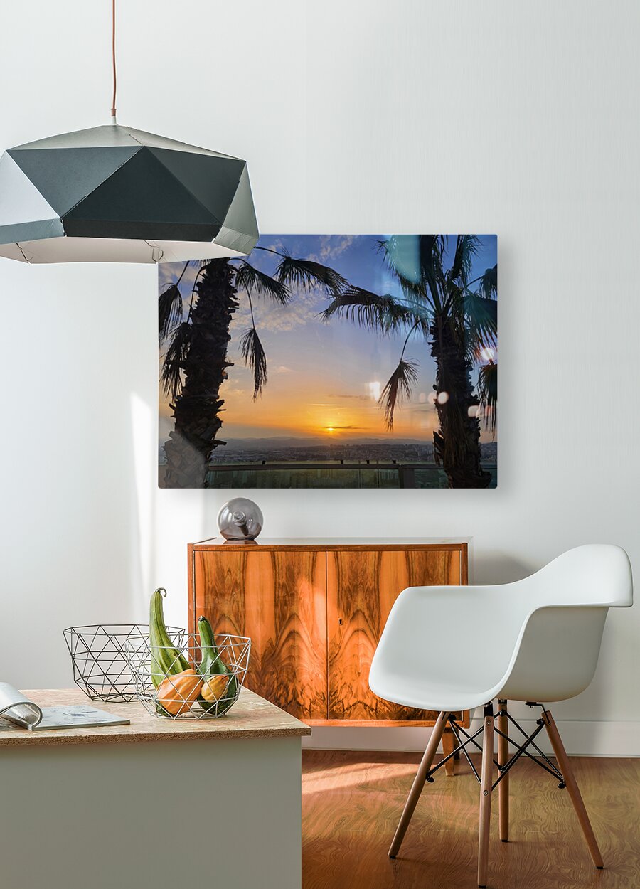 In “Between Palms and Possibility,” the sunset becomes more than just a moment—it transforms into an invitation. This image freezes the silent poetry of evening, with the palm trees acting as natural sentinels watching over a city ready to rest. The vivid sky gradient melts into a softened cityscape below, making this composition ideal for those who seek balance between nature and modern life. On your wall, this piece becomes a meditative window—a visual pause that offers both escape and grounding.