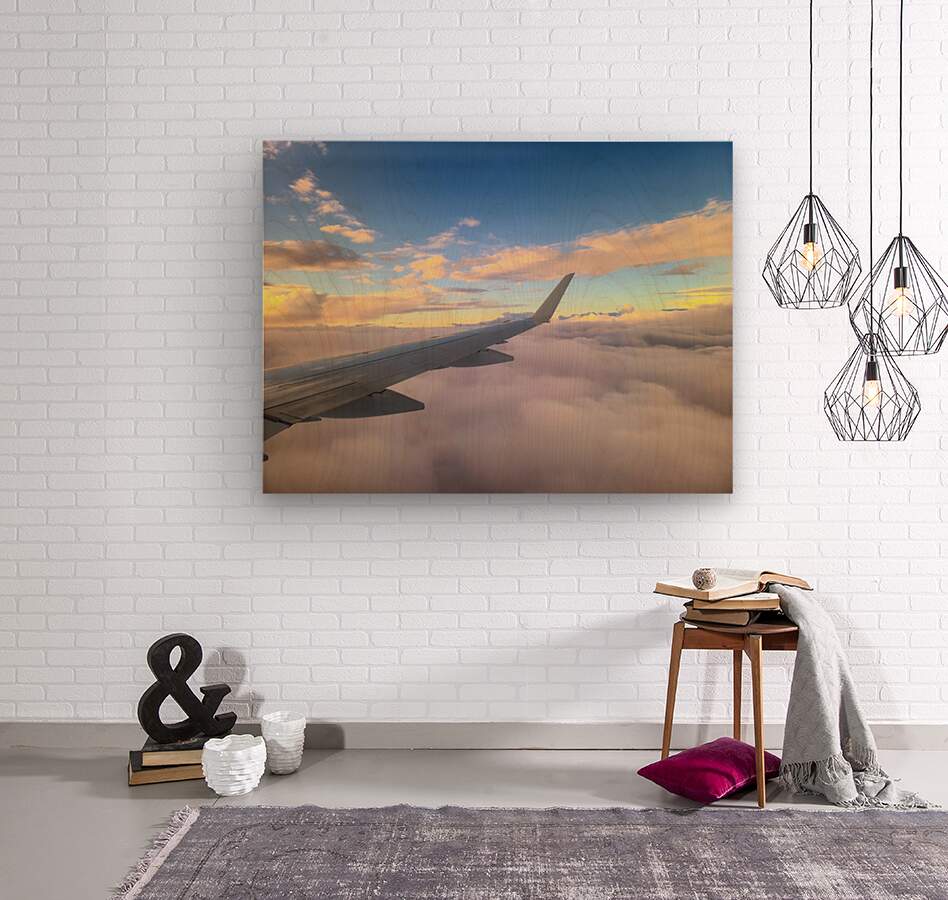 Soft clouds swirl below as the sky above comes alive with warm hues and cool blues. This captivating image invites you to dance among the clouds—an ethereal moment of wonder and peace. The airplane wing’s sleek line adds a touch of grace and perspective, making this photograph a window into a dreamy world above.