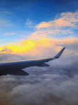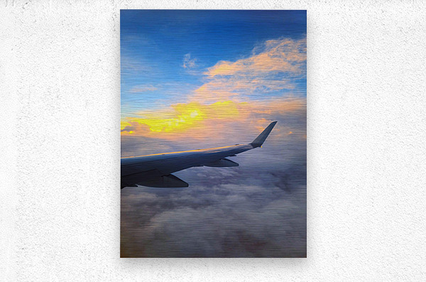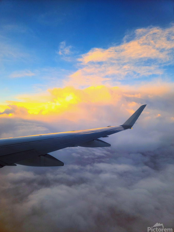 A serene, dreamlike moment above the clouds. The sky’s soft embrace and the sun’s first light create a canvas of quiet wonder, captured in a fleeting instant from the airplane’s wing. Let it be a daily reminder of the beauty that awaits just above the clouds.
