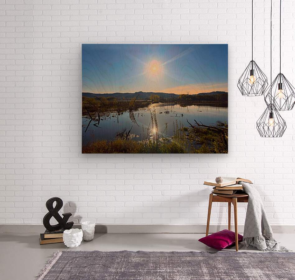 Get this artwork "Sunrise Over Tranquil Wetlands with Sunbeam Reflection" in a framed print.
