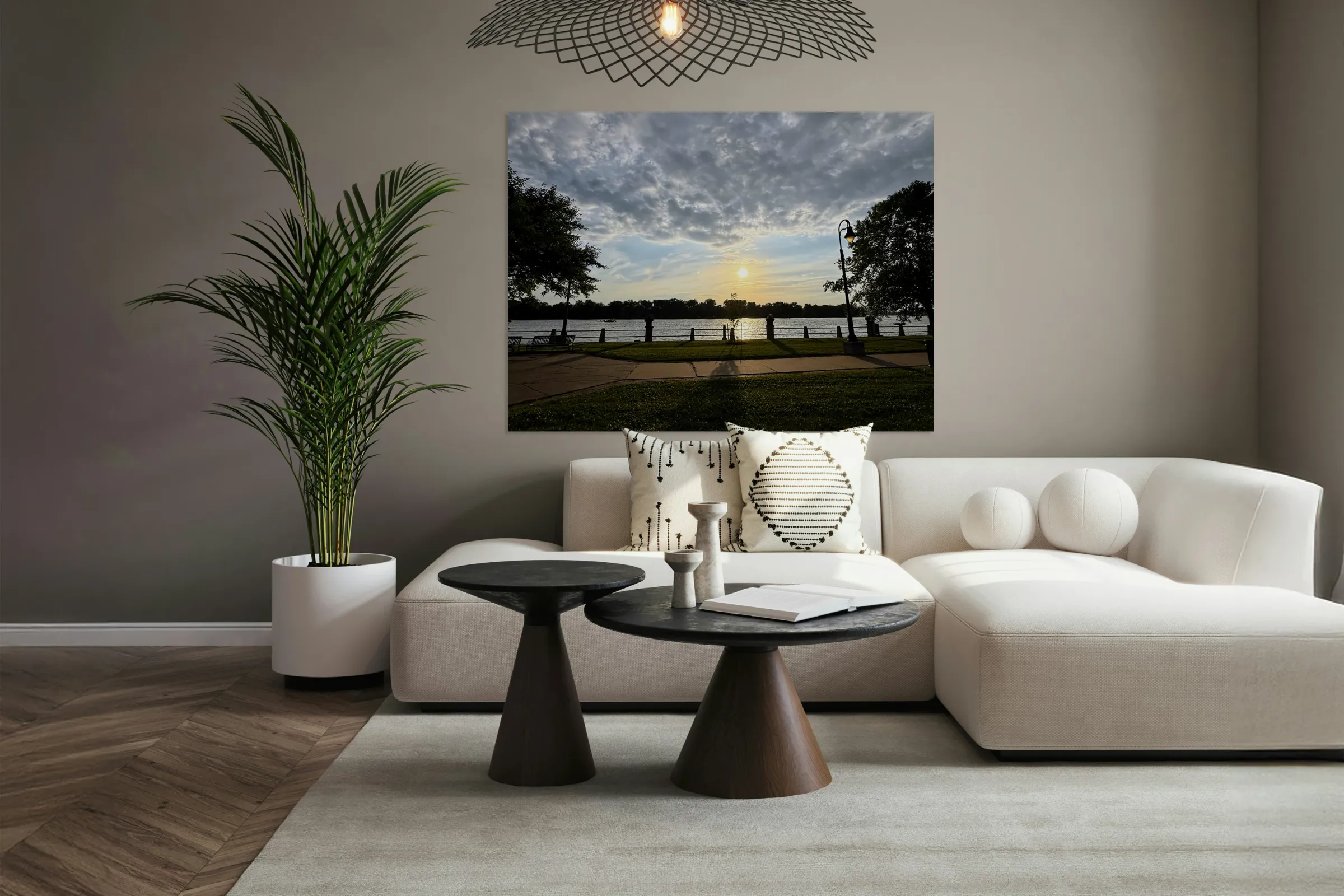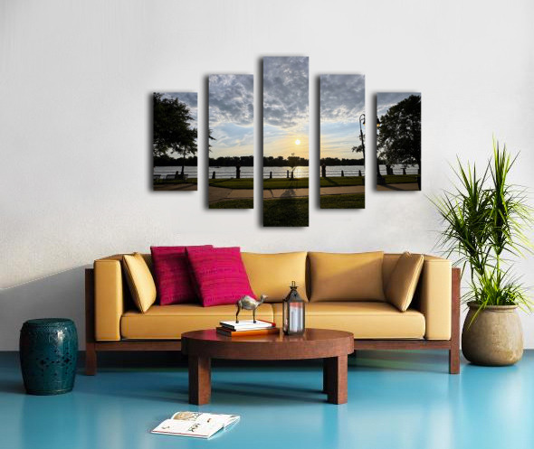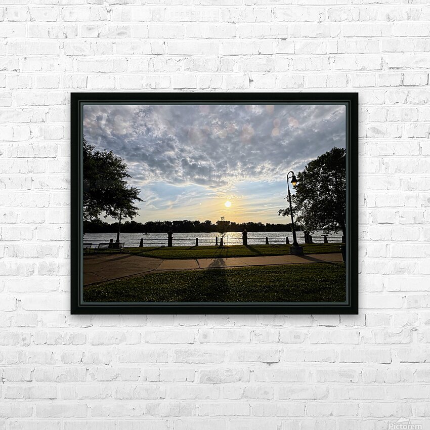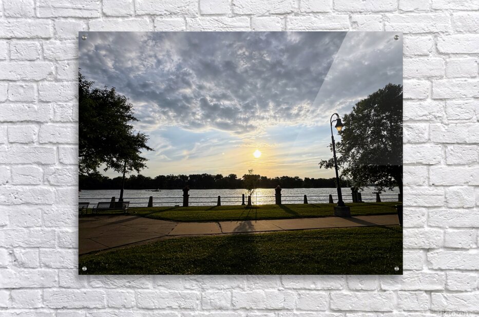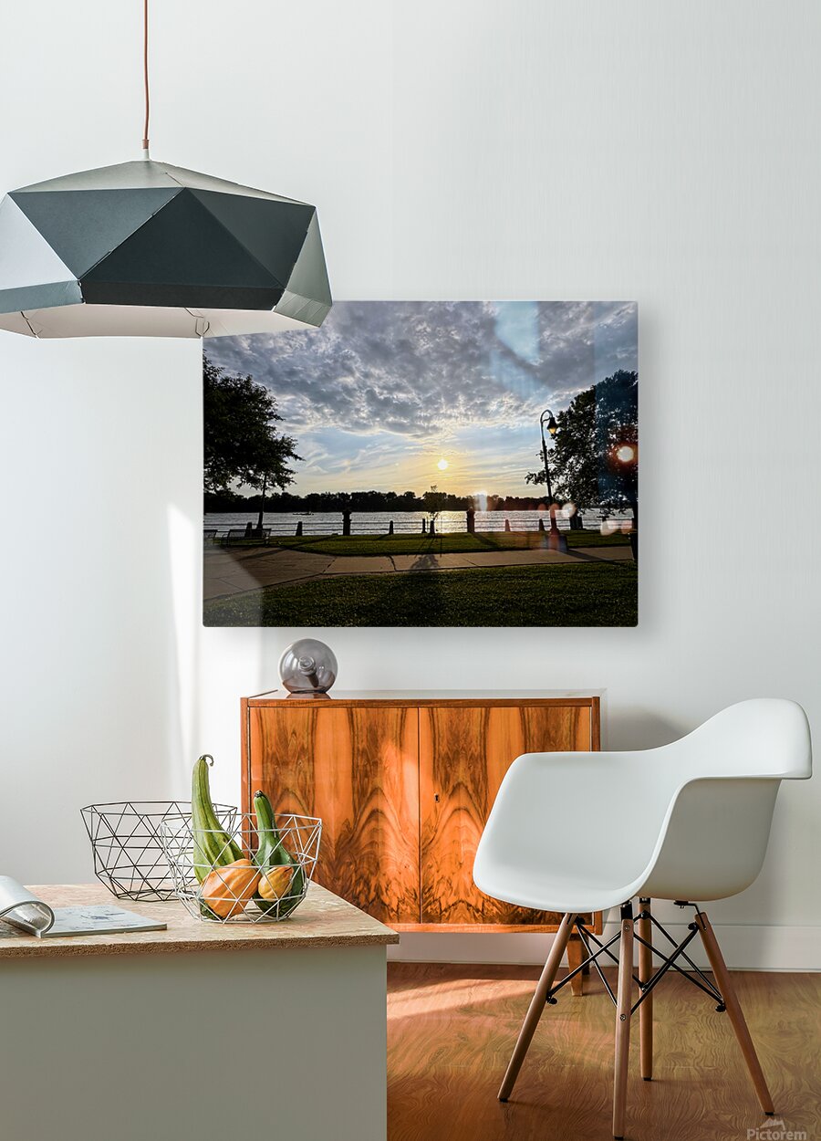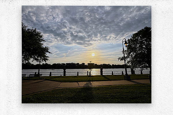 Taken at the precise centerline of a paved riverside walkway, this photograph frames the sinking sun perfectly between silhouetted trees and posts. The moment feels orchestrated by nature and geometry alike. This piece speaks to those who crave balance, whether in art, life, or environment. Ideal for spaces needing visual harmony, this image gently calms the viewer and subtly anchors a room. It is equally fitting in home offices, studios, and yoga or meditation spaces. Its symmetry reassures, while its golden light gently uplifts.