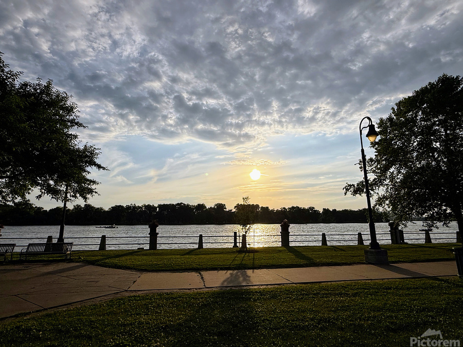 Taken at the precise centerline of a paved riverside walkway, this photograph frames the sinking sun perfectly between silhouetted trees and posts. T...[+]