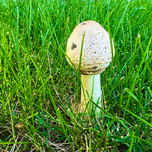This photograph captures a solitary mushroom emerging boldly from a thick bed of vibrant green grass, basking in early sunlight. Its speckled, dome-sh...[+]