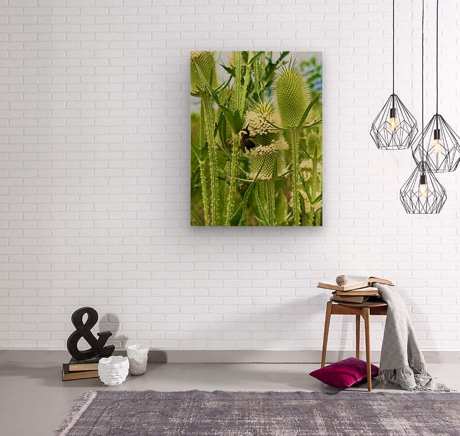 An evocative snapshot of raw nature at work, this photograph shows a bee drawn into a cluster of pale flowers, surrounded by the teasel’s architectural spikes. A conversation starter and a peaceful focal point, this image suits both homes and workplaces.