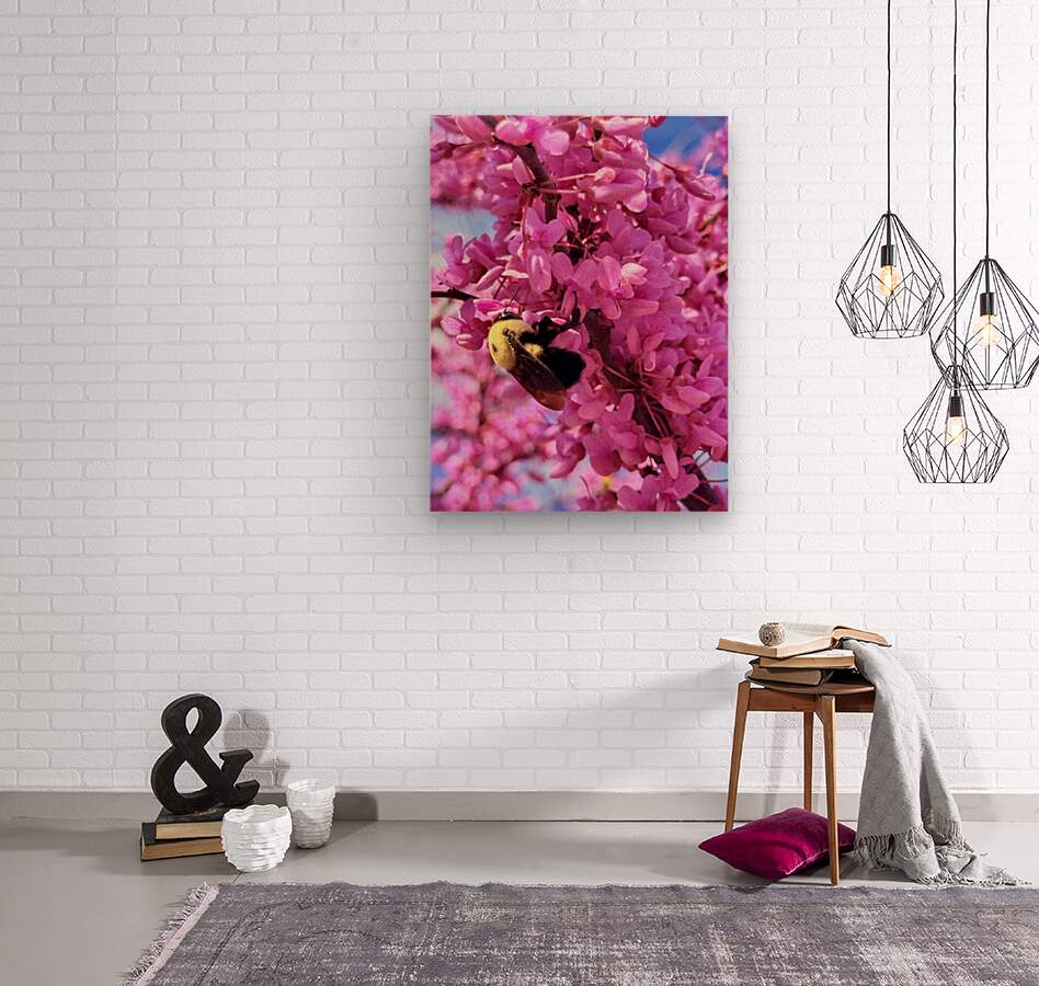 The warm gold of the bee against the cool pink and blue of the background creates a color palette that is rich, harmonious, and deeply pleasing to the eye. As wall art, this piece is a tribute to the small miracles of the natural world. It resonates with gardeners, nature lovers, and anyone who has ever stopped to watch a bee at work.