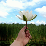 A white lily is lifted skyward like a natural offering, with clouds and reeds painting a serene backdrop. This photograph speaks to lightness, growth,...[+]