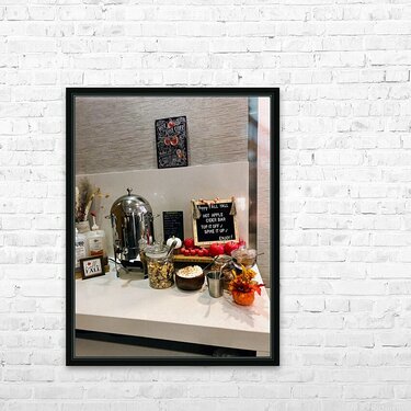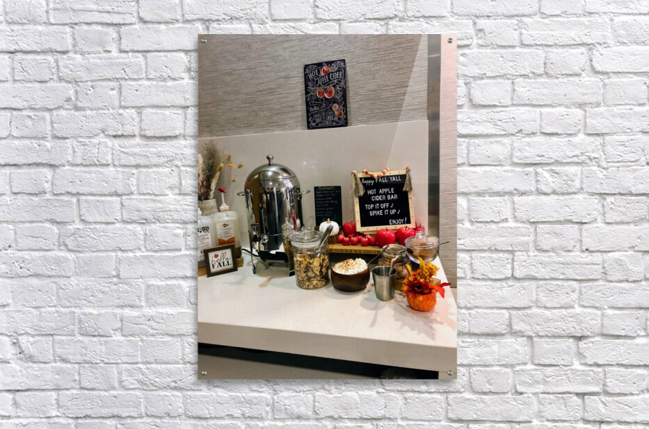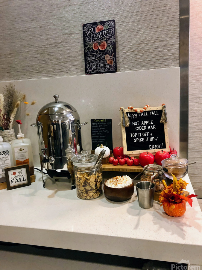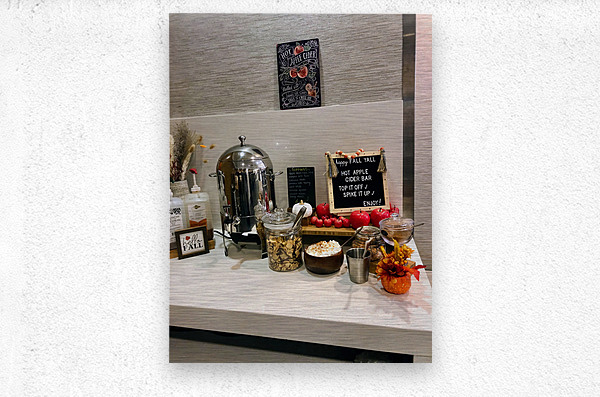Saw this hot apple cider station while waiting for my flight at a Delta Sky Club in Indianapolis airport that was perfect for the fall season. The image brings a warm welcome with its inviting cider station, arranged with attention to rustic detail and seasonal cheer. Dried florals, wooden signage, and rich textures create a harmonious fall vignette. As wall art, it adds charm and an atmosphere of shared moments during the coziest season.