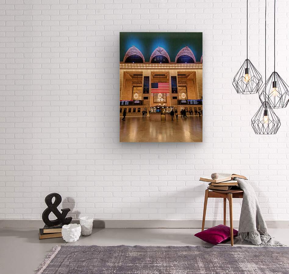 Grand Central Station is one of the iconic places of New York City and one of the busiest places in the world. New York City Collection. A bold look at New York City's Grand Central Terminal, framed by its monumental windows and glowing chandeliers. The central flag serves as a reminder of unity and perseverance. This artwork evokes both history and motion, ideal for urban homes, offices, or galleries seeking powerful American imagery.