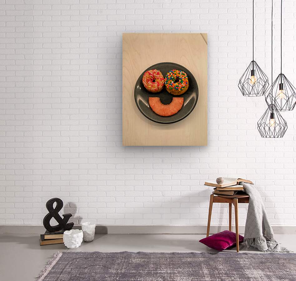 An image that captures the sweet side of optimism, this food arrangement brings a smile to your wall, literally. With two delightfully topped donuts for eyes and a soft pink grapefruit slice forming a smile, this artwork adds charm and playful positivity to any room. Ideal for spaces where joy and color are always welcome.