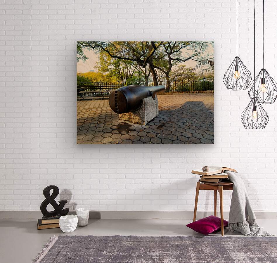 Riverside Park Collection. Fall in New York City is both romantic and beautiful as the leaves change colors. The photograph spotlights a historic cannon embedded in the peaceful ambiance of Riverside Park during fall. Yellowing leaves and long shadows suggest the passage of time, while the setting emphasizes tranquility amidst strength. As wall art, it blends historical reverence with the calming tones of nature and urban architecture.