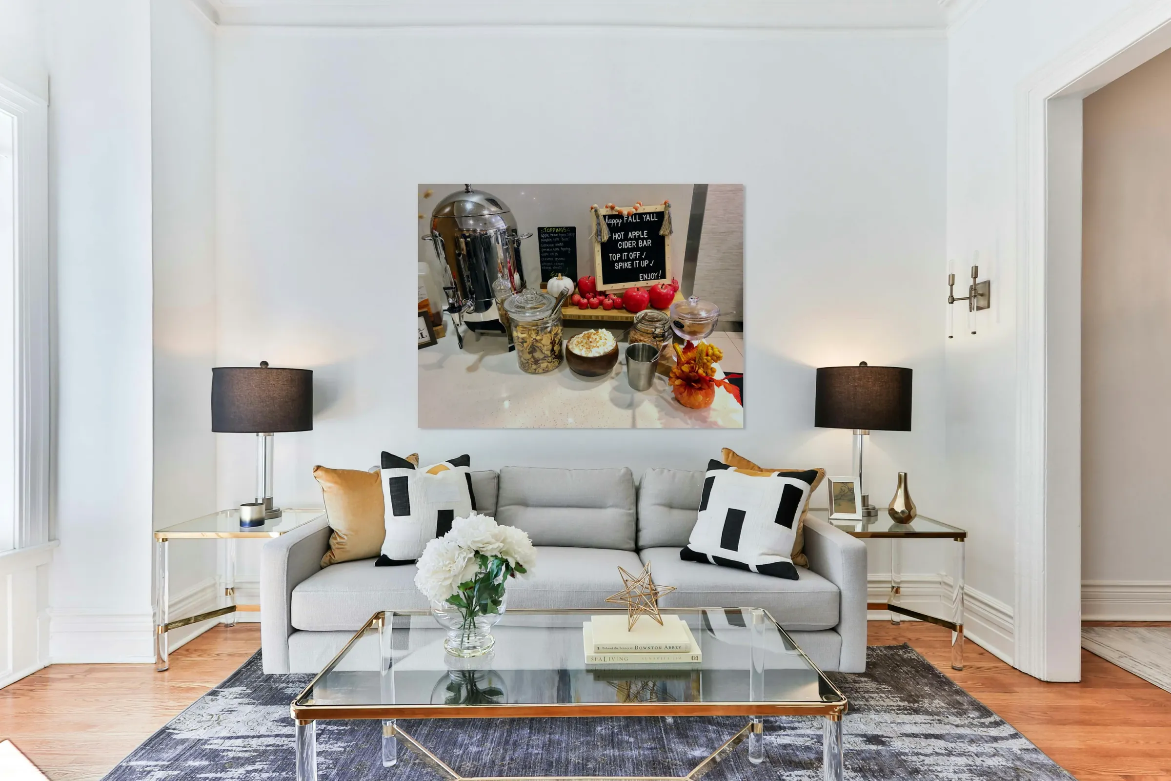A festive autumn setup featuring a hot apple cider bar, garnished with apples, cinnamon, whipped cream, and warm seasonal touches. This photo encapsulates the spirit of fall gatherings and rustic charm. As wall decor, it’s perfect for creating a cozy, inviting ambiance in kitchens, event spaces, or seasonal displays.