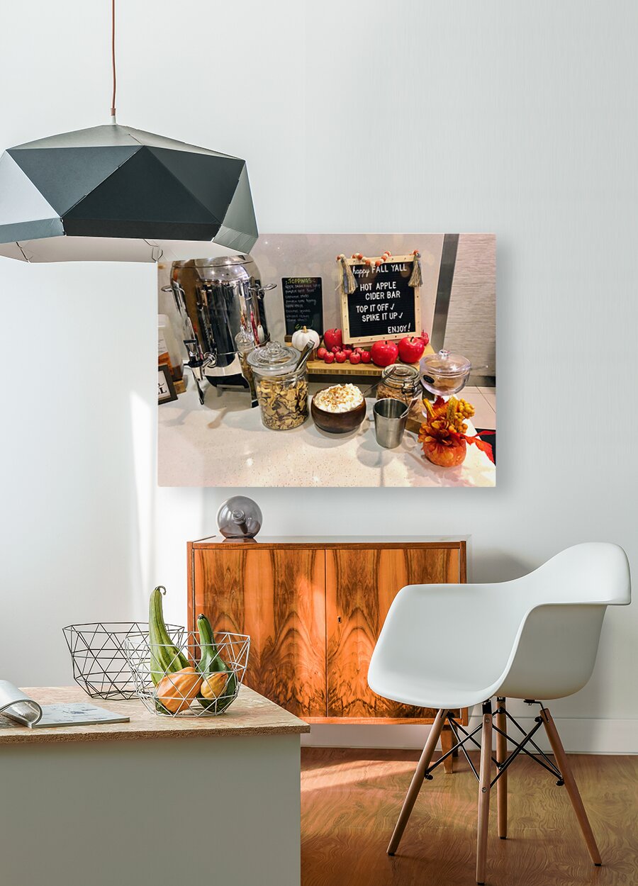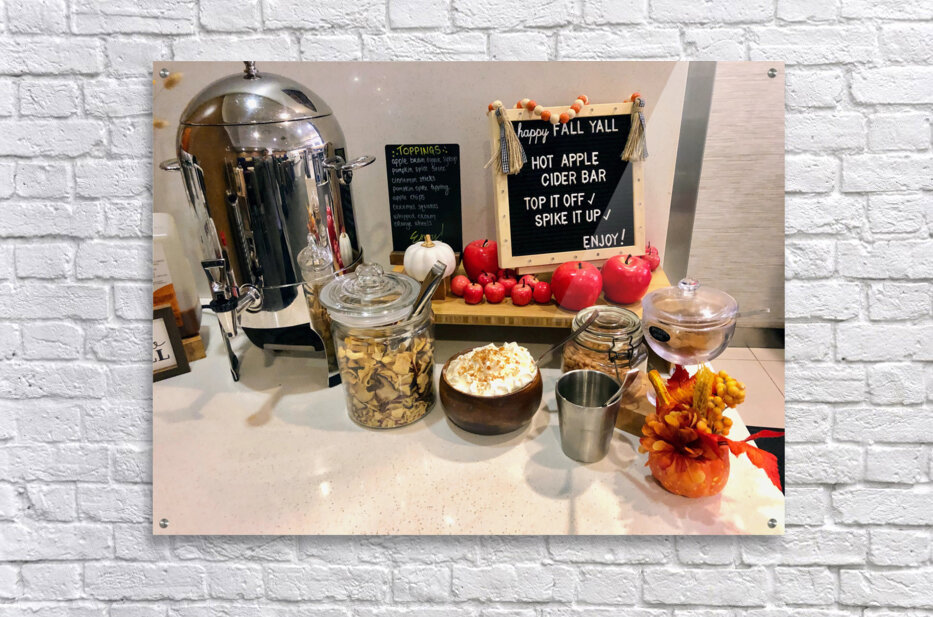 A festive autumn setup featuring a hot apple cider bar, garnished with apples, cinnamon, whipped cream, and warm seasonal touches. This photo encapsulates the spirit of fall gatherings and rustic charm. As wall decor, it’s perfect for creating a cozy, inviting ambiance in kitchens, event spaces, or seasonal displays.