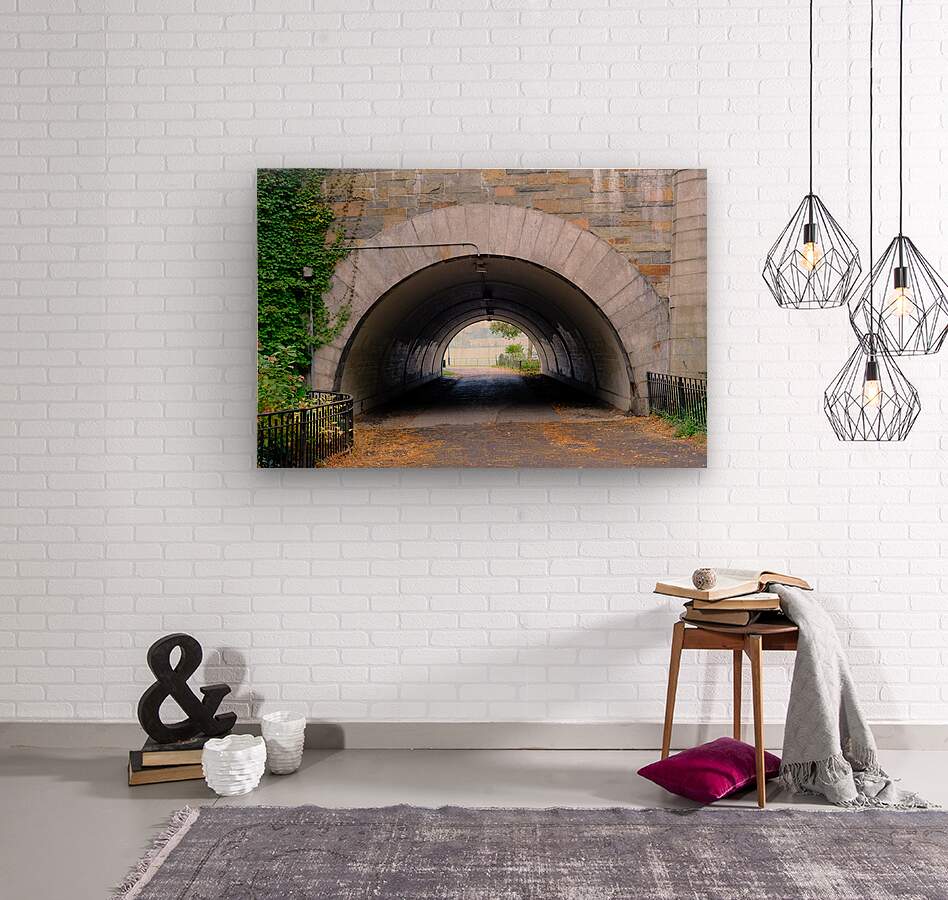 Riverside Park View of Twin Towers in New Jersey. Riverside Park Collection. With its strong architectural curve and quiet tone, this image balances form and feeling. The view beyond the tunnel glows with soft light, offering the suggestion of space, time, and a peaceful destination. A beautiful fit for spaces designed to inspire focus and calm.