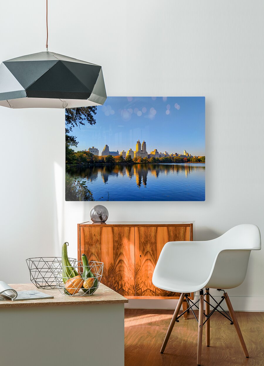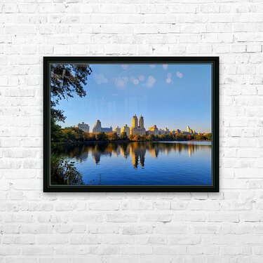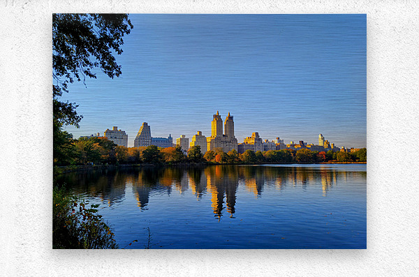 Central Park Reservoir Panoramic Skyline Northview. Central Park Collection. Blending still water with striking architecture, this piece portrays Central Park as a sanctuary nestled within one of the world’s busiest cities. The reflections enhance its soothing quality, making it a perfect print to inspire reflection and calm in any urban or professional setting.