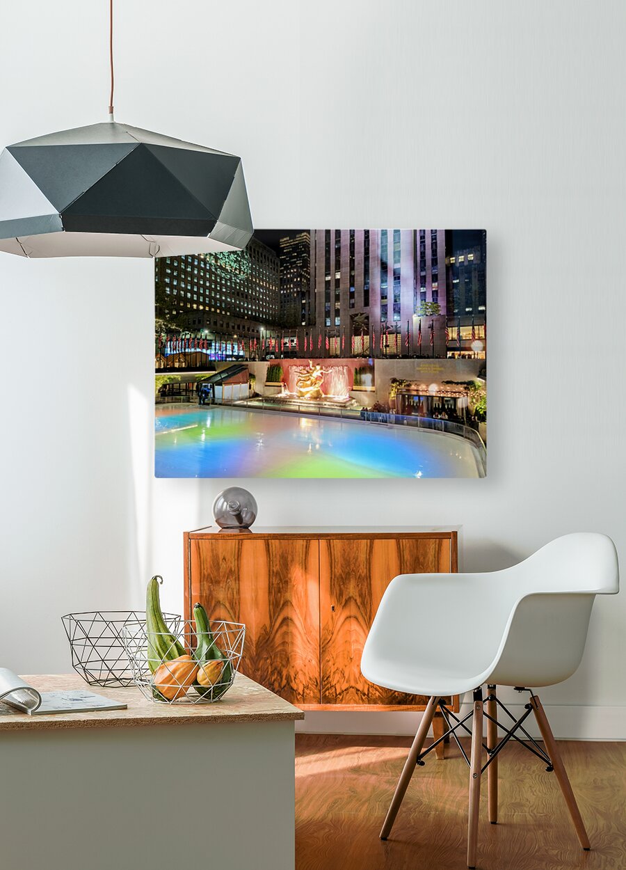 Rockefeller Center Rainbow Ice Rink .New York City Collection This captivating nightscape captures the iconic Rockefeller Center ice rink in New York City, illuminated by vibrant rainbow lighting across its icy surface. The golden Prometheus statue glows under the soft shimmer of festive lights, creating a magical winter ambiance. As wall art, this piece brings the essence of New York’s holiday charm into any space, celebrating joy, color, and the energy of a world-famous landmark.