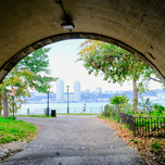 Riverside Park View of Twin Towers in New Jersey. Riverside Park Collection. This photograph invites the viewer through a quiet archway into a rivers...[+]