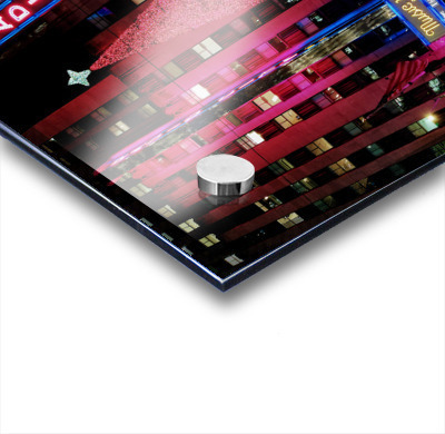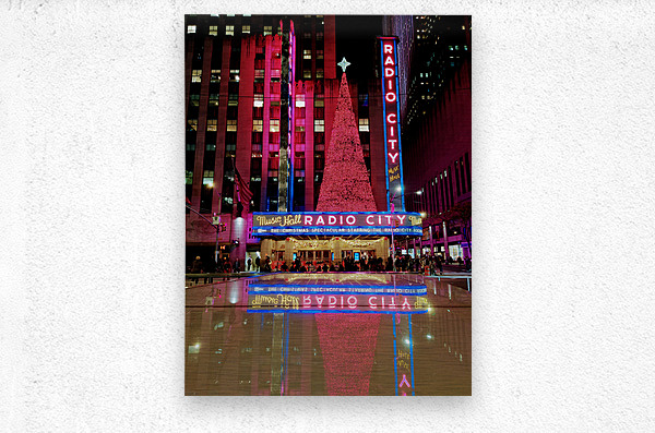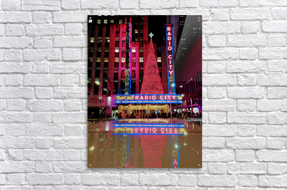 New York City Collection. Celebrate the essence of New York City's holiday season with this dramatic and vibrant image of Radio City Music Hall. The electric hues of pink and blue paired with mirror-like reflections bring this festive scene to life, ideal for those seeking dynamic, colorful wall art that captures the energy and beauty of the holidays in the city.