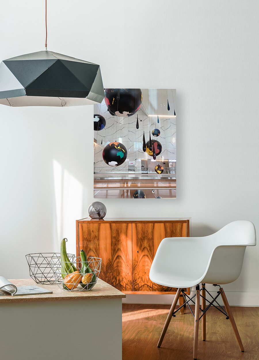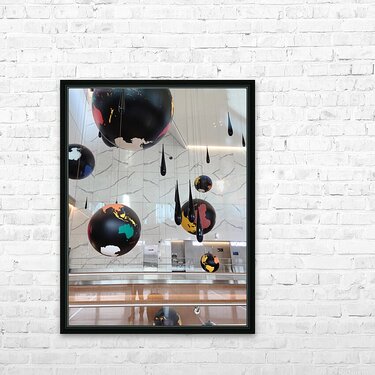 This captivating photo captures an artistic installation from LaGuardia Airport featuring a cluster of suspended black globes, each painted with colorful continents, accompanied by teardrop-shaped elements descending from above. As wall art, this piece invites viewers to reflect on the beauty and complexity of our planet from a global perspective. It’s perfect for modern interiors, workspaces, or travel-themed environments where visual storytelling and bold, conceptual aesthetics are desired. The installation evokes themes of unity, movement, and environmental contemplation, making it an ideal choice for those inspired by culture and global awareness.