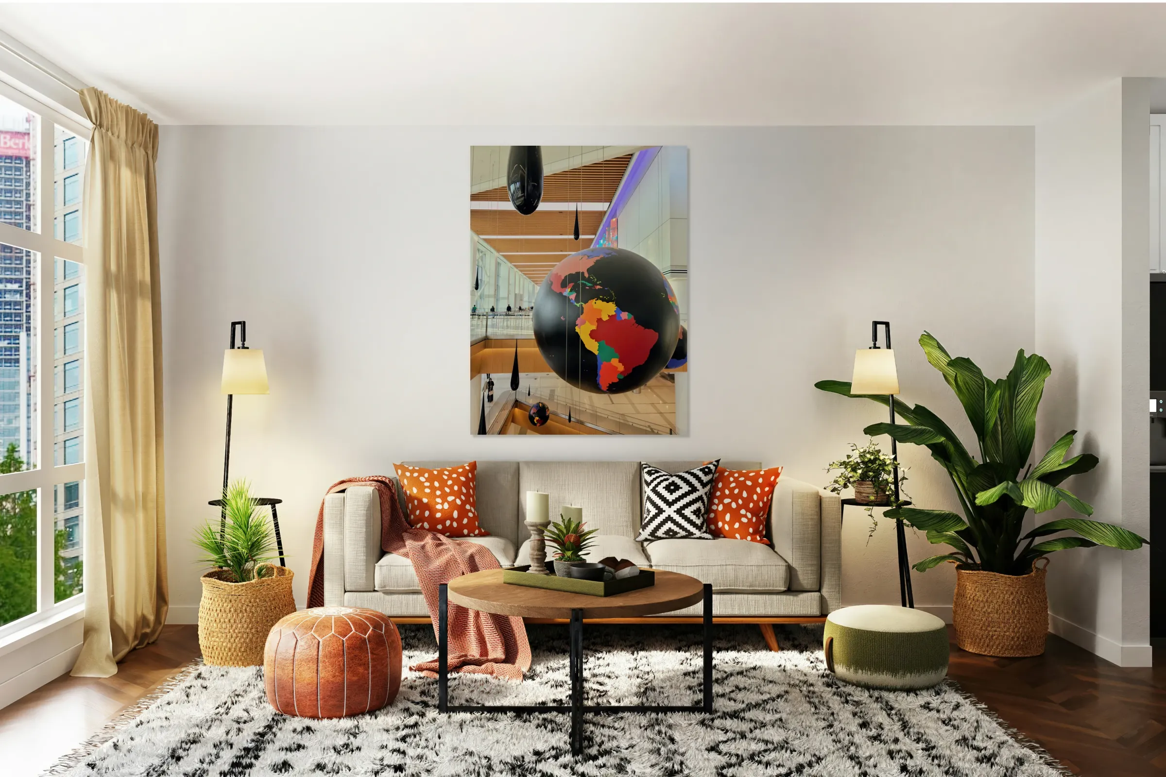 This artistic display hanging from the ceiling at La Guardia Airport. This immersive installation blends bold cartographic globes with sleek, suspended droplets to create a surreal, contemplative atmosphere. The juxtaposition of massive orbs and teardrop forms evokes themes of gravity, balance, and global interconnectedness. As wall art, it becomes a bold statement piece, inviting reflection on movement, presence, and the delicate forces that shape our world.