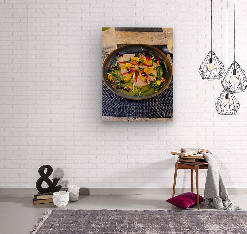 This beautiful dish is served at Tidal, a restaurant at Paradise Point Resort & Spa. A vibrant plate of Hamachi crudo, meticulously layered with citrus segments, chili slivers, and an abundance of microgreens and edible flowers, this image captures the sensual choreography of flavor, texture, and color. It tells a story of craftsmanship, terroir, and fleeting beauty. It invites the viewer to slow down and marvel at the intersection of art and appetite. As a wall art, this becomes more than food photography, it is a meditation on fleeting beauty, the ephemeral nature of creativity, and the sensory poetry that lives between color and taste. This piece is ideal for upscale dining spaces, creative studios, or kitchens where culinary passion meets artistic soul. It doesn’t scream “food” in the traditional sense, it whispers freshness, balance, and care. It’s a reminder that the same discipline used by painters and musicians is alive and well in the hands of a chef. Hung on a wall, it becomes a daily prompt to approach every craft—be it cooking, creating, or simply living—with intention and wonder.