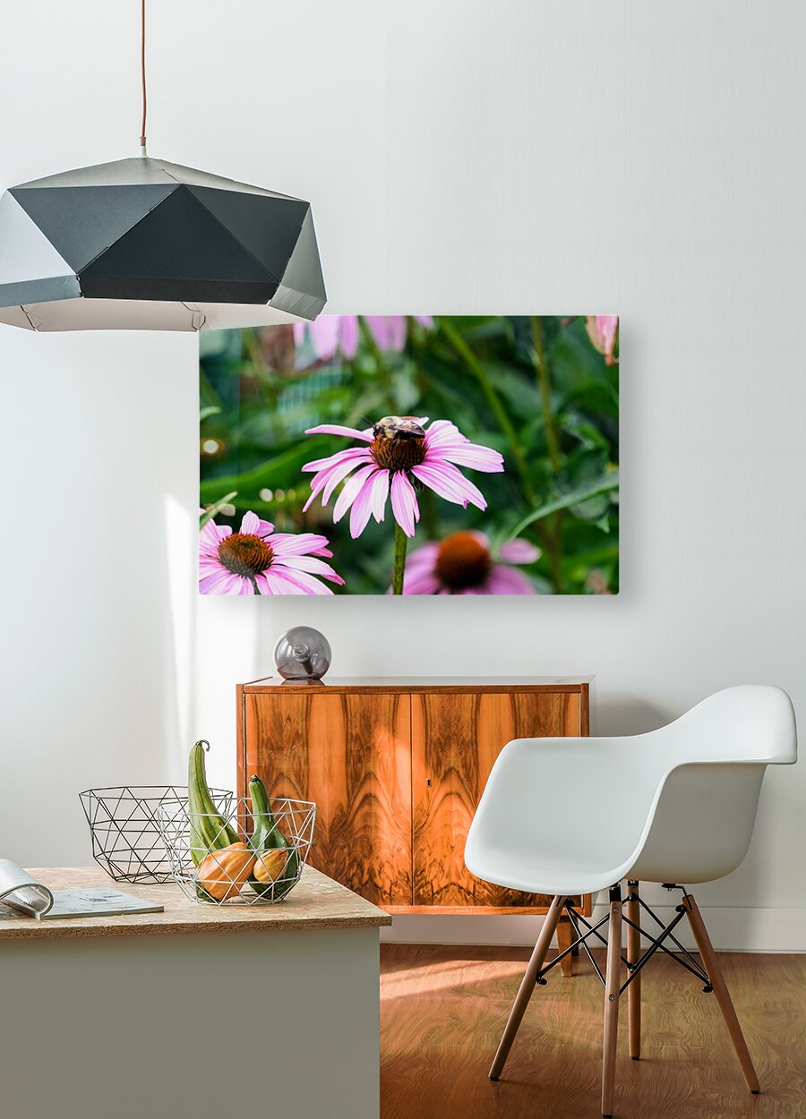 The Bee Collection. A bee rests on a purple coneflower, captured in a rare moment of purposeful pause. Every detail, the glistening thorax, the patterned cone, the slightly curved petals speaks to a choreography perfected over millennia. This is more than an image; it's a meditation in motion. This piece evokes a grounded kind of elegance, a whisper of purpose, resilience, and cooperation. As a wall accent, it channels gentle inspiration for those working toward meaningful goals. It’s a perfect fit for workspaces, counseling offices, or serene home corners.