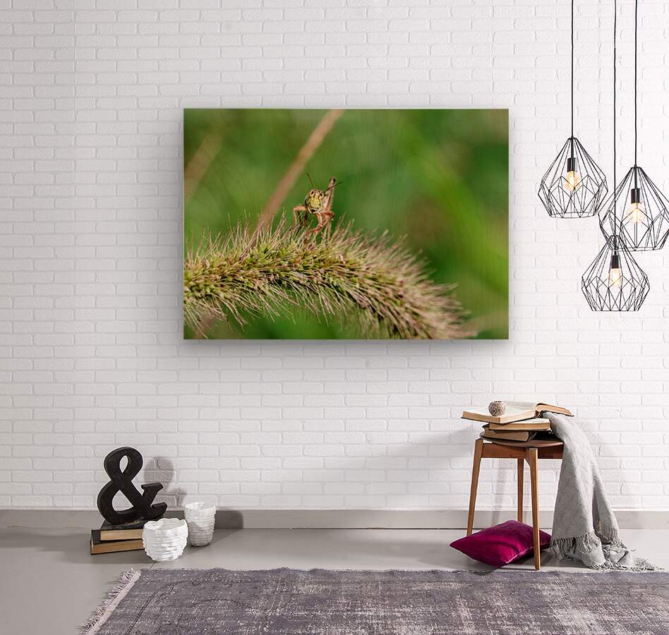 A grasshopper perches delicately on the feathery spine of a wild grass, like a whispered thought lingering on a breeze. The foreground bristles glow with life, while the background dissolves into a wash of green serenity. The harmony of natural form and fine detail reveals a moment between movement and memory. A contemplative piece for bedrooms, libraries, or reflective spaces. It speaks of fragility and fortitude, the quiet power of nature’s smallest actors, and the beauty found in soft-spoken resilience. A daily nudge to find grace in stillness.