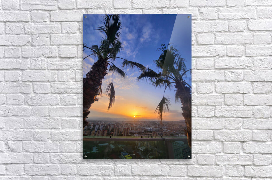 The golden sun drifts downward, casting its last light between two resilient palms. Beneath it, a city exhales under twilight’s spell. This photograph invites the viewer to breathe with the city—one last inhale before nightfall, one last golden gift from the day. A tranquil bridge between the exotic and the urban, this image is perfect for meditation rooms, lounges, or any interior needing calm energy. It evokes stillness without emptiness—a thoughtful pause in the world’s rush.