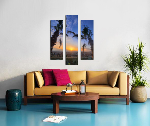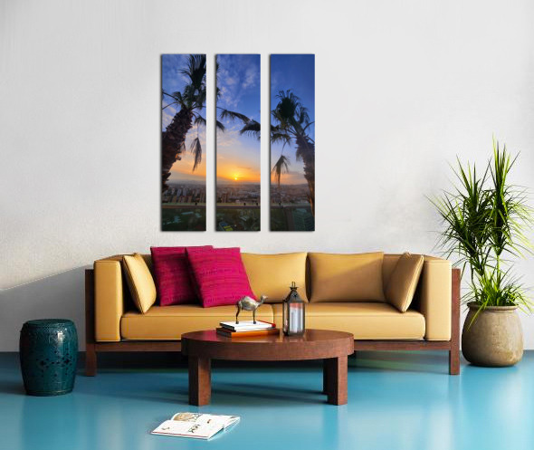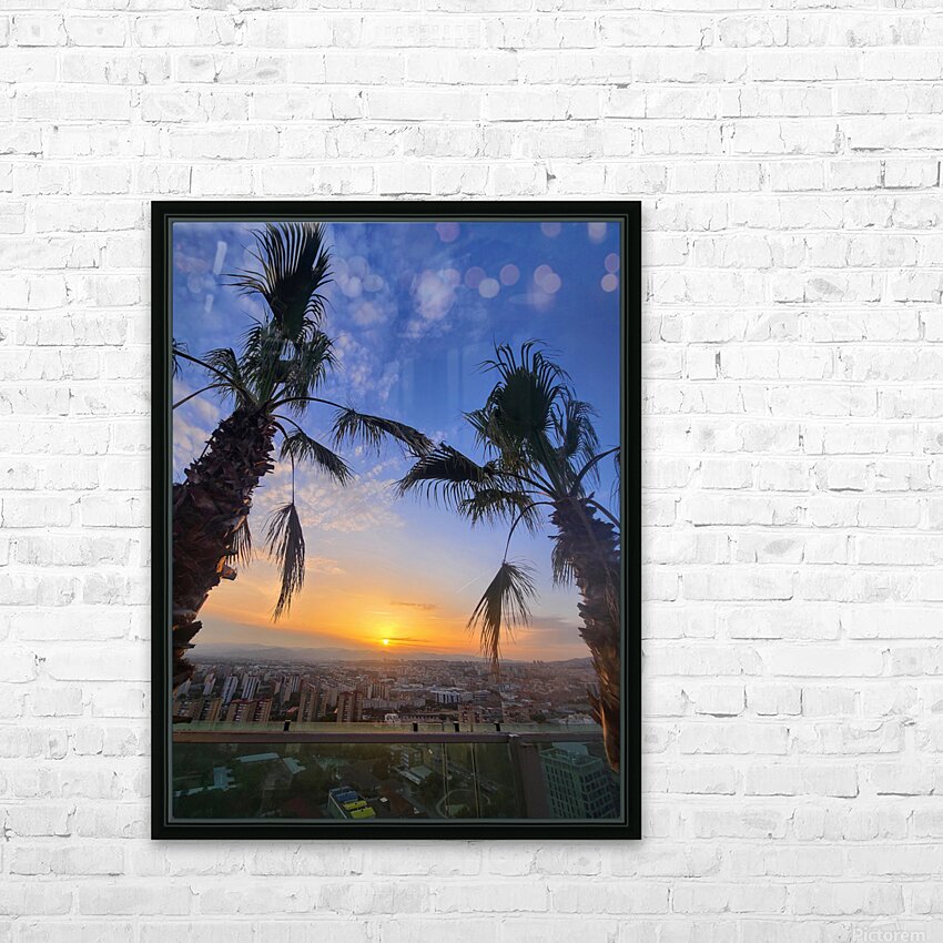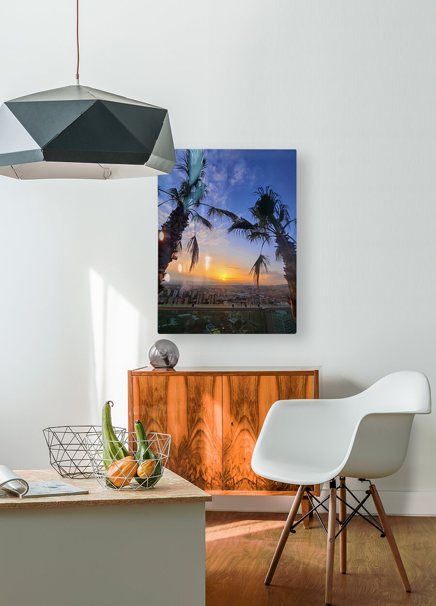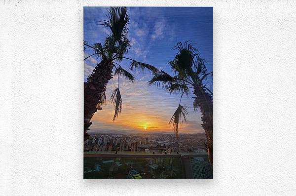 The golden sun drifts downward, casting its last light between two resilient palms. Beneath it, a city exhales under twilight’s spell. This photogra...[+]