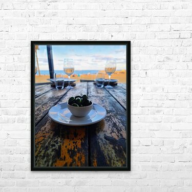 Barcelona Travel Collection. This was taken at the Cordoba Restaurant in Barcelona. Captures the essence of simplicity: a humble bowl of olives on an aged wood table, with the gentle hum of the sea in the background. It's not just food—it’s the feeling of unplugging. The contrasting textures between the rustic wood, the clean white plate, and the ocean's blue echo a balance of grounding and openness. This wall piece invites introspection, ideal for reading nooks, meditation rooms, or kitchens that feed more than the body.