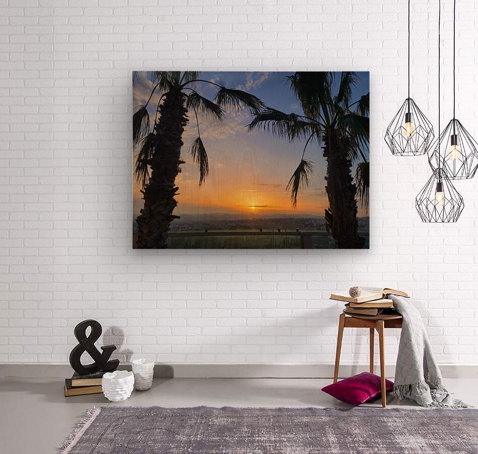 In “Between Palms and Possibility,” the sunset becomes more than just a moment—it transforms into an invitation. This image freezes the silent poetry of evening, with the palm trees acting as natural sentinels watching over a city ready to rest. The vivid sky gradient melts into a softened cityscape below, making this composition ideal for those who seek balance between nature and modern life. On your wall, this piece becomes a meditative window—a visual pause that offers both escape and grounding.
