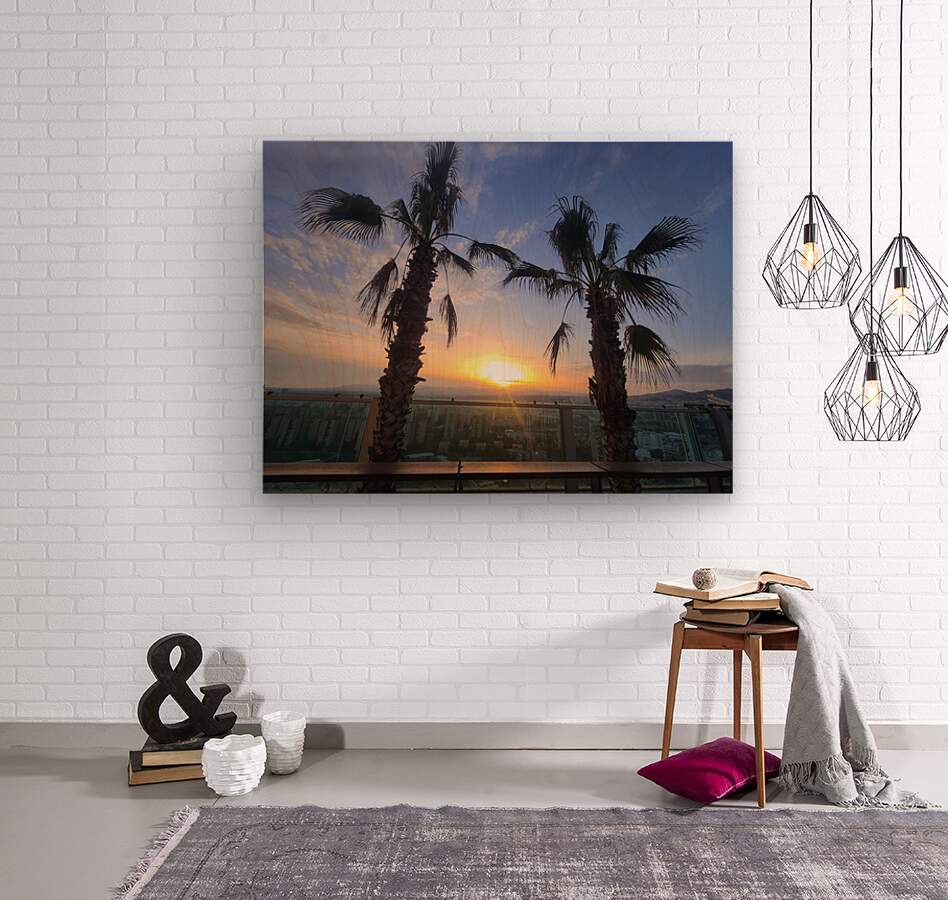 Palms Over the Skyline captures a rare juxtaposition—tropical stillness above the rhythm of city life. As the sun dips low, twin palm trees frame the last light of day, casting long shadows and cooling the warmth of dusk. The glass rail echoes the city’s sleek architecture, while the fiery sky nods to nature’s daily spectacle. This piece is perfect for those who crave the energy of the city but long for a breath of ocean air. Hang it in a modern loft or office to create a mood of balance and bold simplicity.