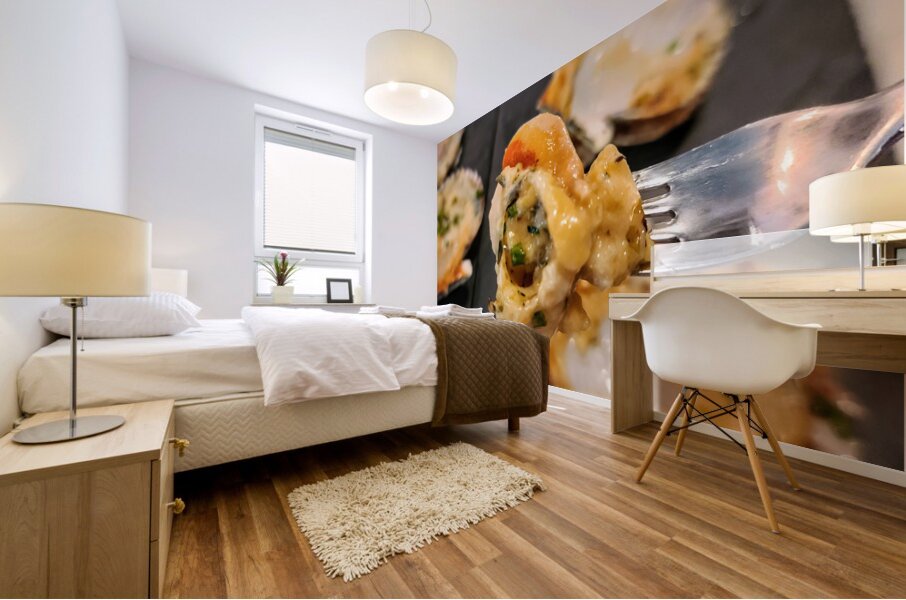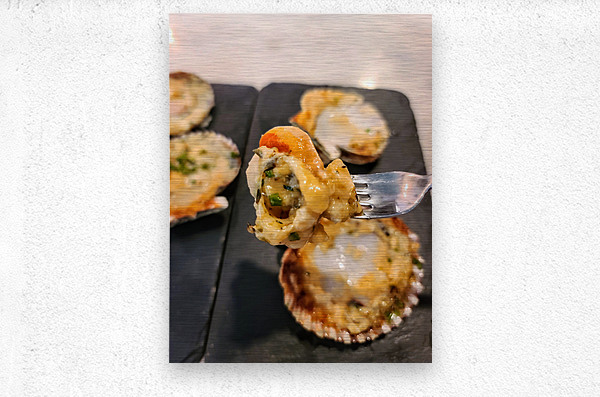 The act of dining becomes a lyrical performance. A succulent scallop, gleaming under a melty cheese layer and finely chopped herbs, is lifted like a crescendo off its scallop shell. This piece speaks to the harmony between sea and plate, between human touch and natural beauty. As wall art, it lends a poetic spirit to the kitchen or dining space—elegant, refined, and deeply evocative of the sea’s quieter moments. Ideal for those who cherish subtlety, beauty, and the unspoken music in a well-composed dish.