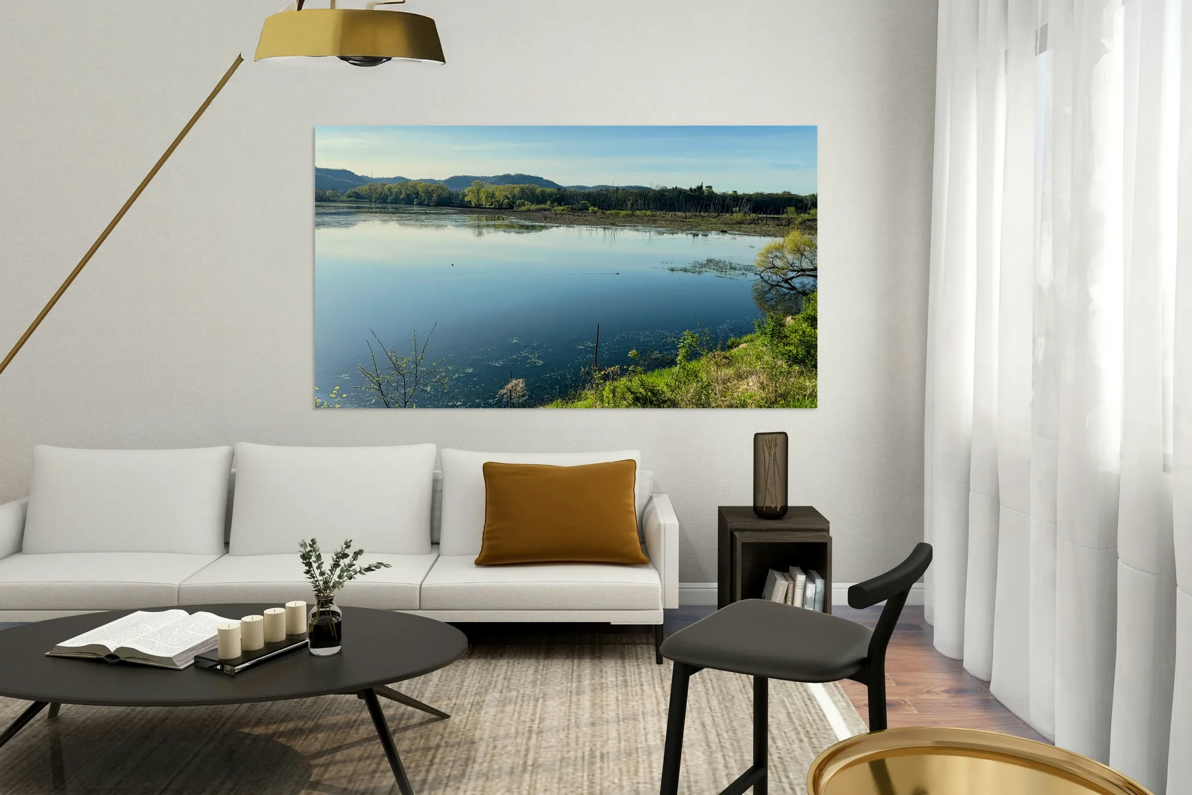 Tranquil and serene, this peaceful landscape captures the stillness of a reflective lake bordered by lush greenery and distant forested hills. The gentle ripples on the water and the soft blue sky add a sense of calm and natural beauty, making this an ideal image for wall art, nature-themed decor, or digital backgrounds. The composition evokes a deep connection to the outdoors and the quiet charm of untouched nature.