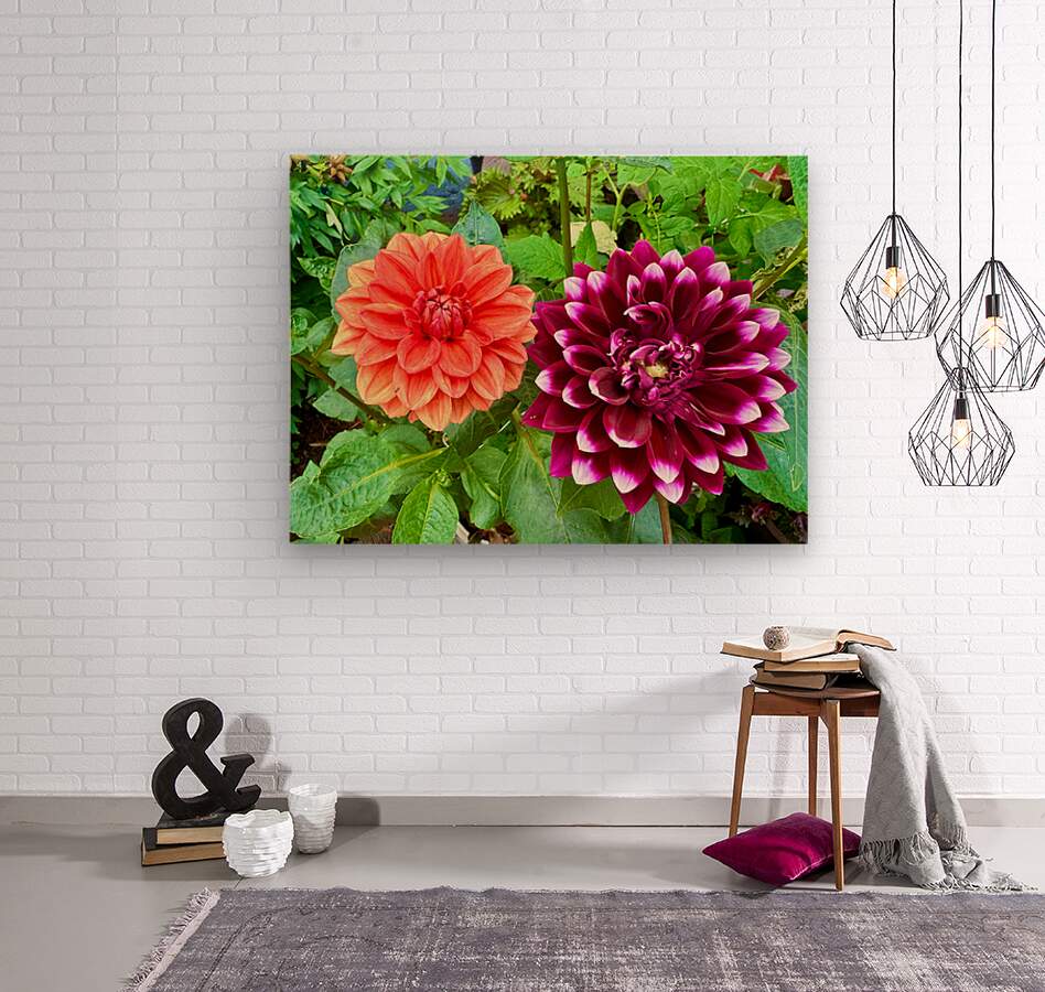 This striking image captures a rare and radiant moment where two dahlias one a fiery orange, the other a deep magenta with ivory tips bloom side by side. Each blossom reflects nature’s artistry, boasting intricate symmetry and vibrant color, evoking passion, contrast, and unity in a single frame. A celebration of opposites in harmony. As wall art, it symbolizes harmony between opposing energies: bold and calm, warm and cool, assertive and gentle. It’s a daily reminder that strength lies not in uniformity, but in the power of coexistence.