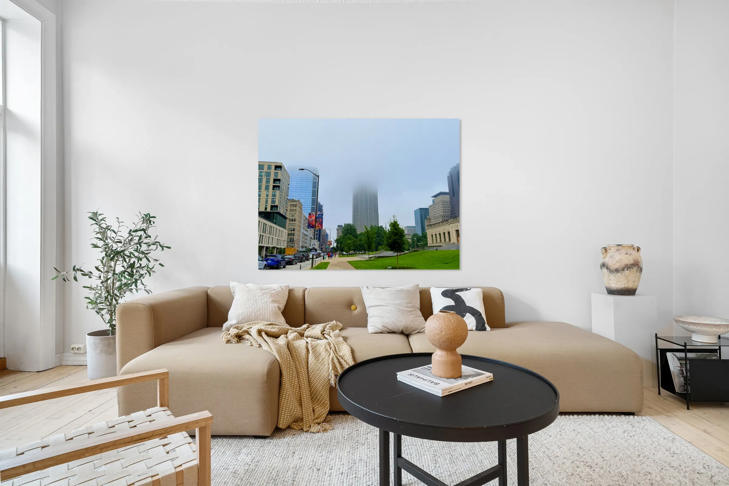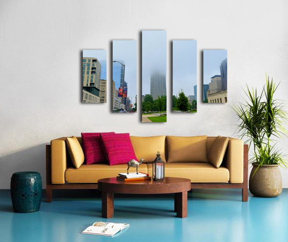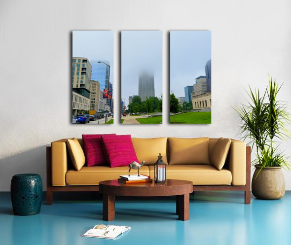 Captures a morning walk through a bustling city street, with a towering skyscraper partially hidden by low-hanging fog. This atmospheric blend of urban geometry and soft mist makes for a meditative wall art piece, perfect for those who appreciate urban serenity.