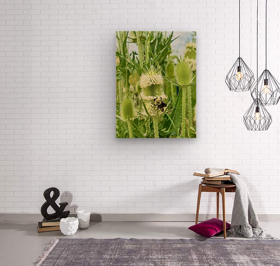 The juxtaposition of sharp teasel bracts and the soft buzz of a bumblebee creates a striking visual contrast. This image offers calm and complexity to any room, ideal for eco-themed interiors or offices that seek a fresh natural touch.
