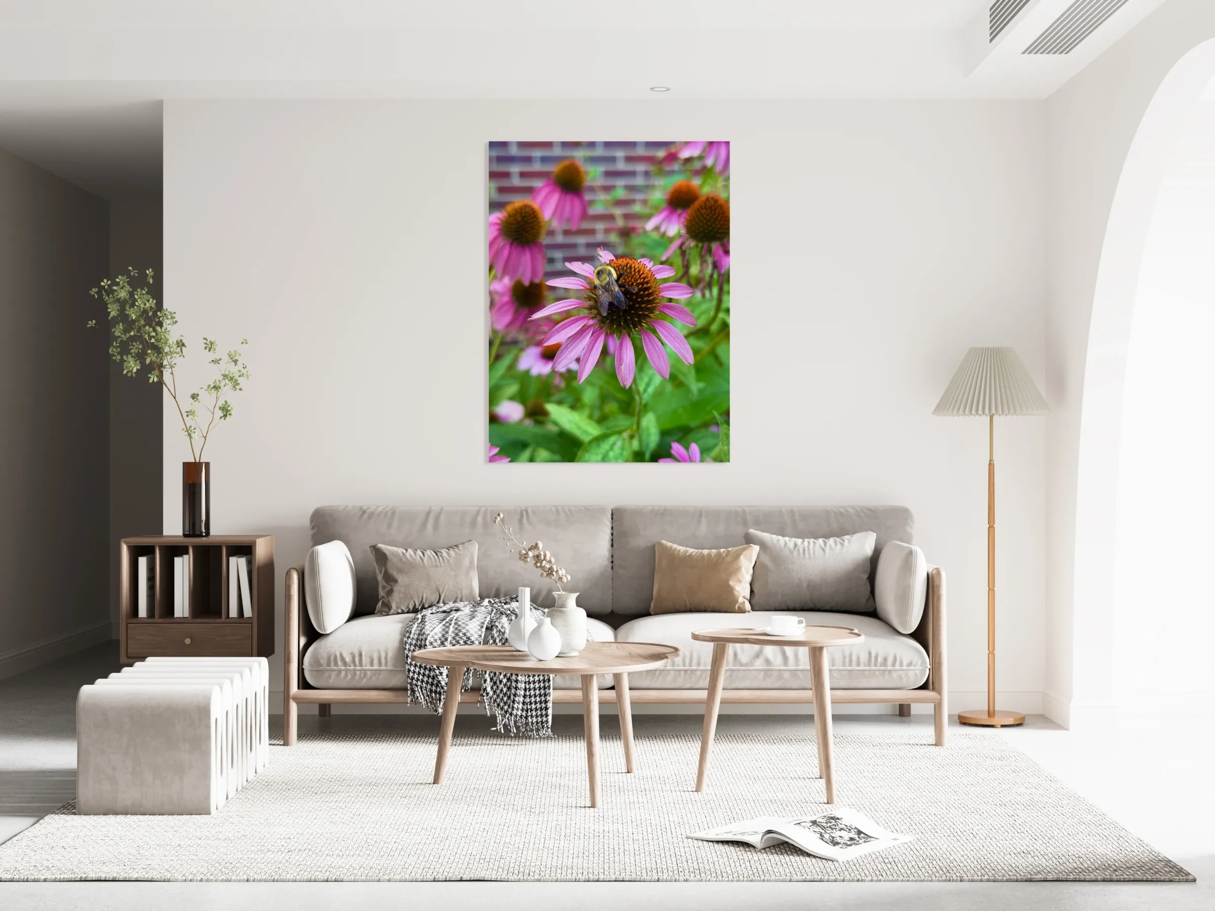 Captures the delicate balance between flora and fauna. A bumblebee rests atop a vivid pink coneflower, bringing a sense of tranquility and connection to nature. This wall art is perfect for evoking a peaceful garden atmosphere in your space.