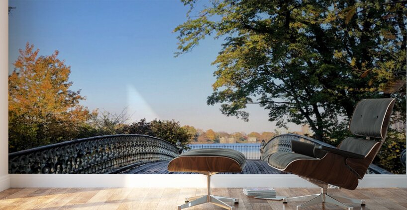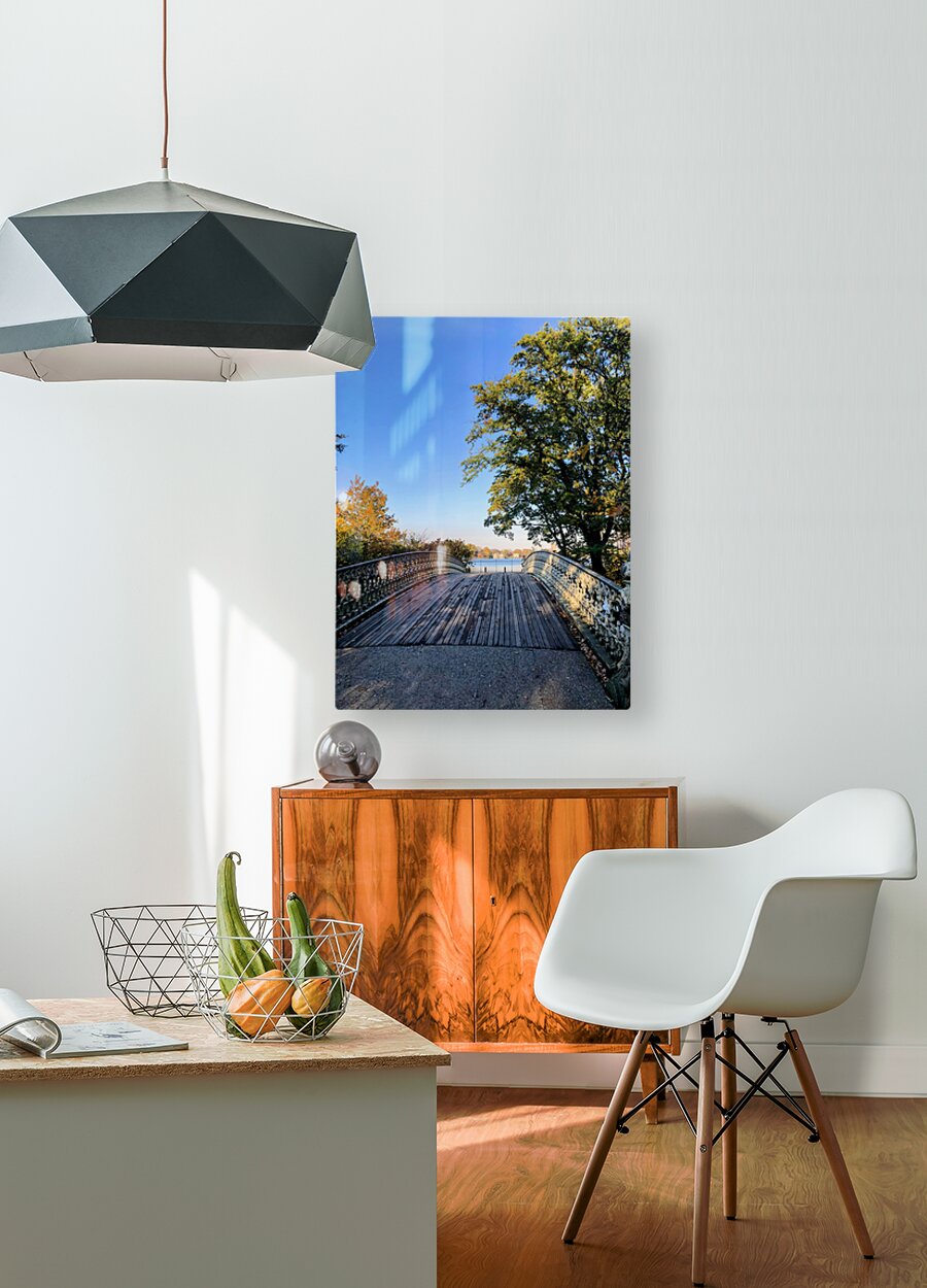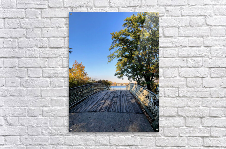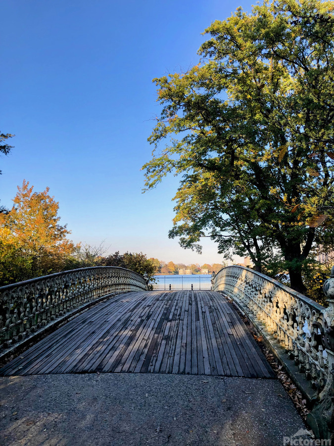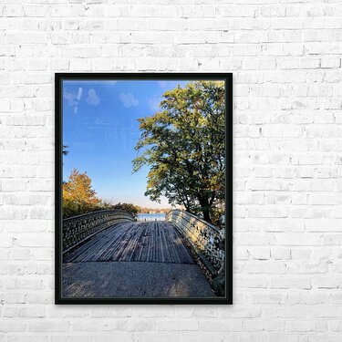 Bridge to Central Park Reservoir . Central Park Collection. Blending human craftsmanship with natural beauty, this photograph reveals the delicate structure of a Central Park bridge guiding the viewer toward a glistening horizon. Framed by autumn’s golden hues, it symbolizes transition, escape, and the stillness found in movement. A refined addition to any space, this piece communicates introspection and elegance.