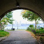 Riverside Park View of Twin Towers in New Jersey. Riverside Park Collection. A graceful tunnel opens onto a peaceful riverside walkway, framed by tr...[+]