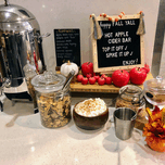 A festive autumn setup featuring a hot apple cider bar, garnished with apples, cinnamon, whipped cream, and warm seasonal touches. This photo encapsul...[+]