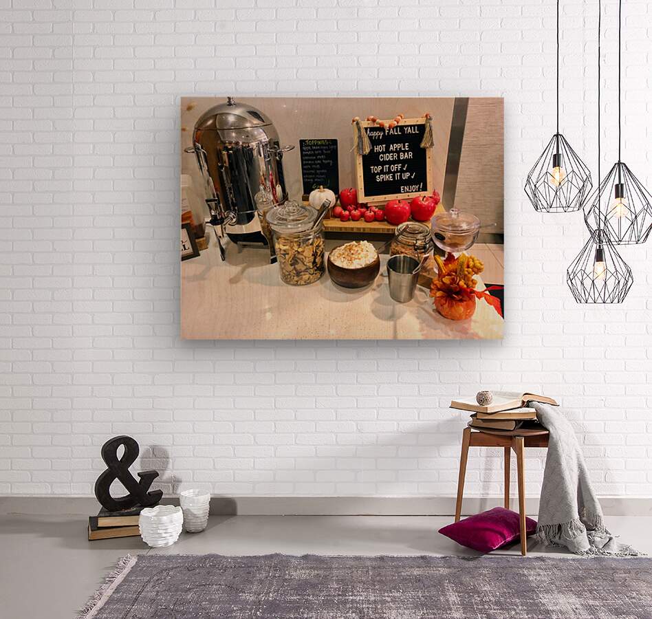 A festive autumn setup featuring a hot apple cider bar, garnished with apples, cinnamon, whipped cream, and warm seasonal touches. This photo encapsulates the spirit of fall gatherings and rustic charm. As wall decor, it’s perfect for creating a cozy, inviting ambiance in kitchens, event spaces, or seasonal displays.